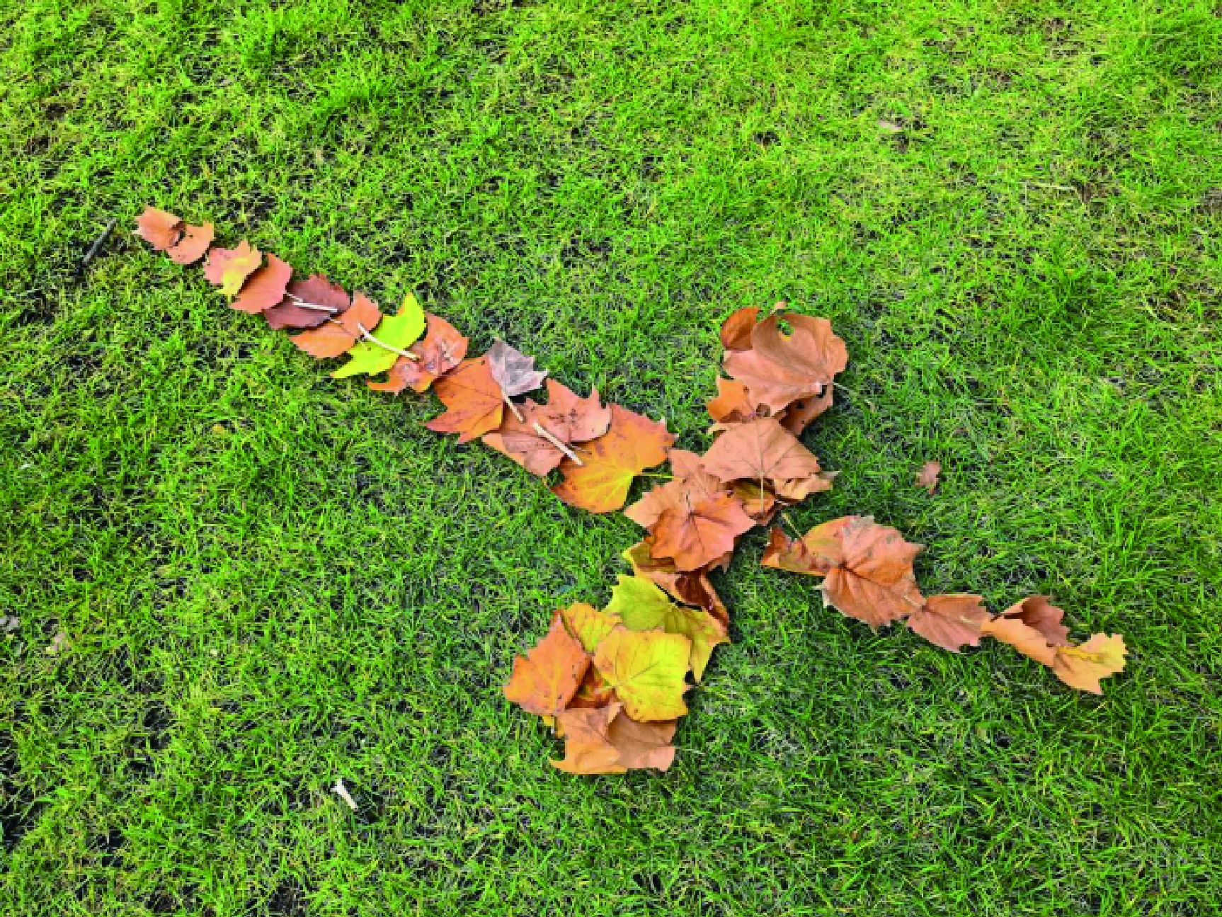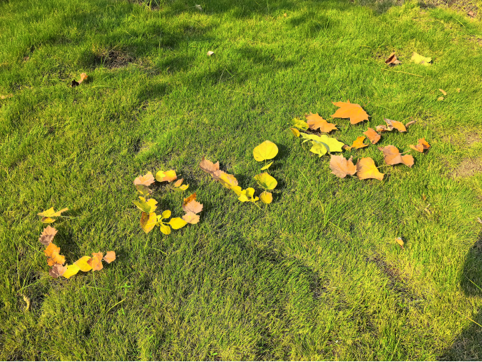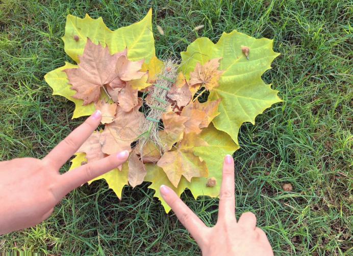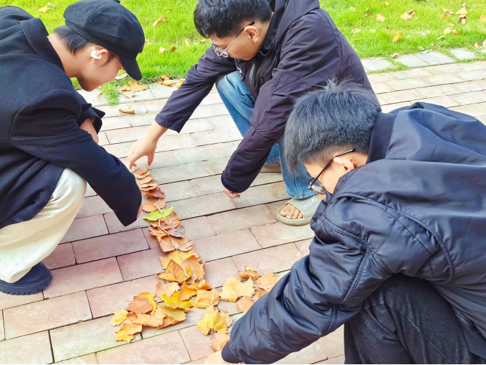 收集落叶后,同学们在草地上以落叶为素材,开始自由创作。原本零散的叶片,在他们的巧思与协作下,逐渐拼合成一幅幅充满隐喻的画面: