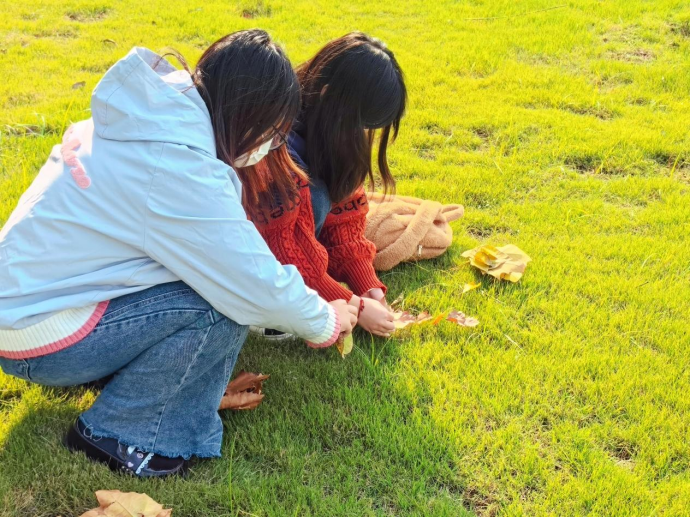 活动伊始,学生们漫步于金色草坪。他们放缓脚步,仔细搜寻着属于自己的那片叶子。弯腰拾起的瞬间,不仅是与自然的触碰,更是对内心节奏的一次调整。有同学表示:“平时总急着赶路,很少低头看脚下。当真正蹲下来,才发现每片叶子都有自己的纹理和故事,就像我们每个人一样独特。”