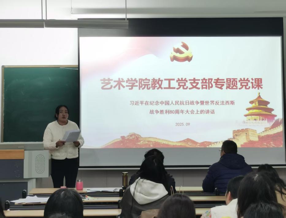 为深切缅怀革命先辈的丰功伟绩,弘扬伟大的爱国主义精神和抗战精神,激励全体教工党员在新时代砥砺前行,艺术学院教工党支部于9月25日召开了“传承抗战精神,共庆祖国华诞”专题党课。支部全体党员齐聚一堂,深入学习研讨习近平总书记在纪念中国人民抗日战争暨世界反法西斯战争胜利80周年大会上的重要讲话,并结合艺术学院专业特色,探讨如何将讲话精神转化为推动艺术教育高质量发展的实际行动。