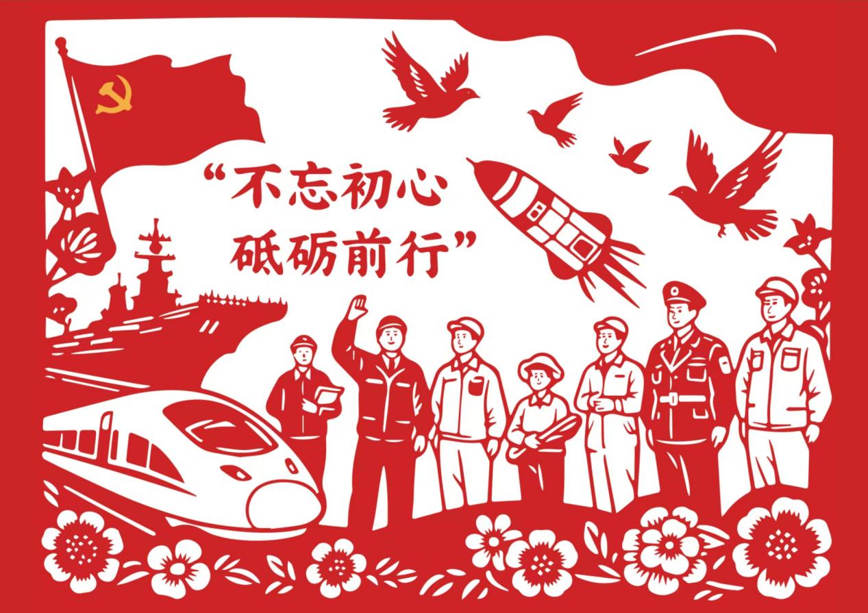 这幅红色剪纸作品紧扣“匠心铸魂·艺心向党”主题,以传统剪纸技艺为载体,绘就出新时代青年面向2026年的奋进蓝图。画面以党旗为精神坐标,航母、高铁、火箭等元素展现国家在国防、科技领域的发展成就;工人、军人、学生等不同职业的人物剪影并肩而立,象征社会各界携手奋进的集体力量;飞鸟与繁花元素传递对繁荣未来的美好祈愿,“不忘初心 砥砺前行”的文案则锚定了青年传承红色基因、践行使命的精神内核。创作者以刀为笔、以纸为媒,将家国情怀与时代发展相联结,既是对党的初心使命的致敬,也是艺术学子以匠心践行担当、奔赴新征程的生动宣言。