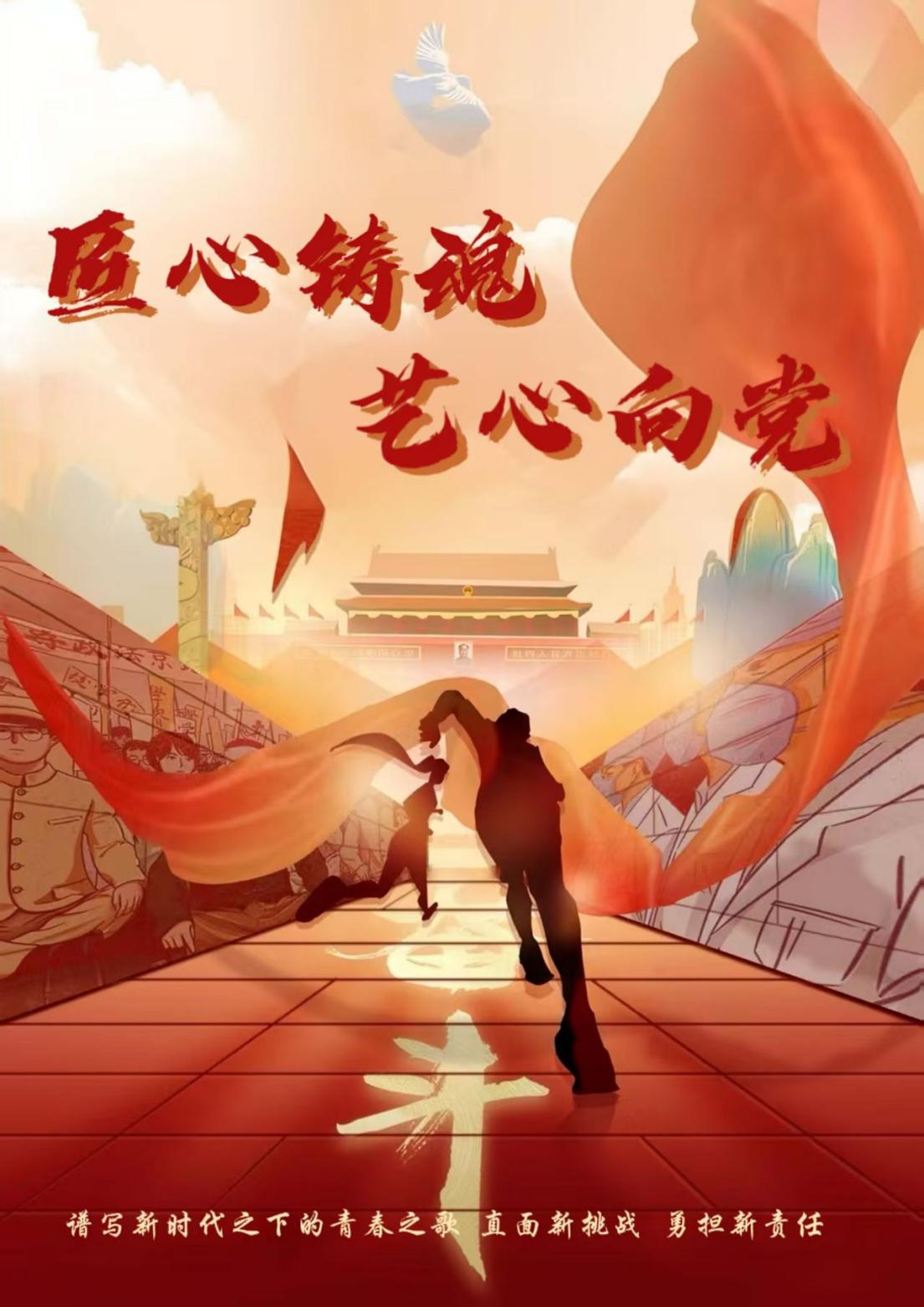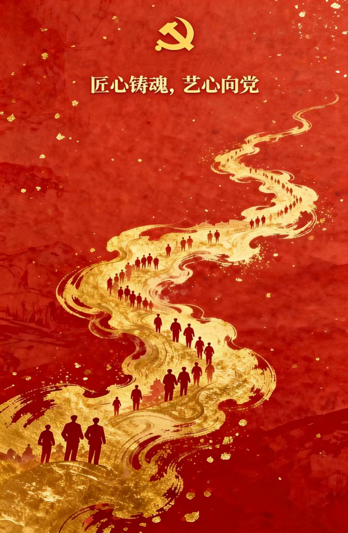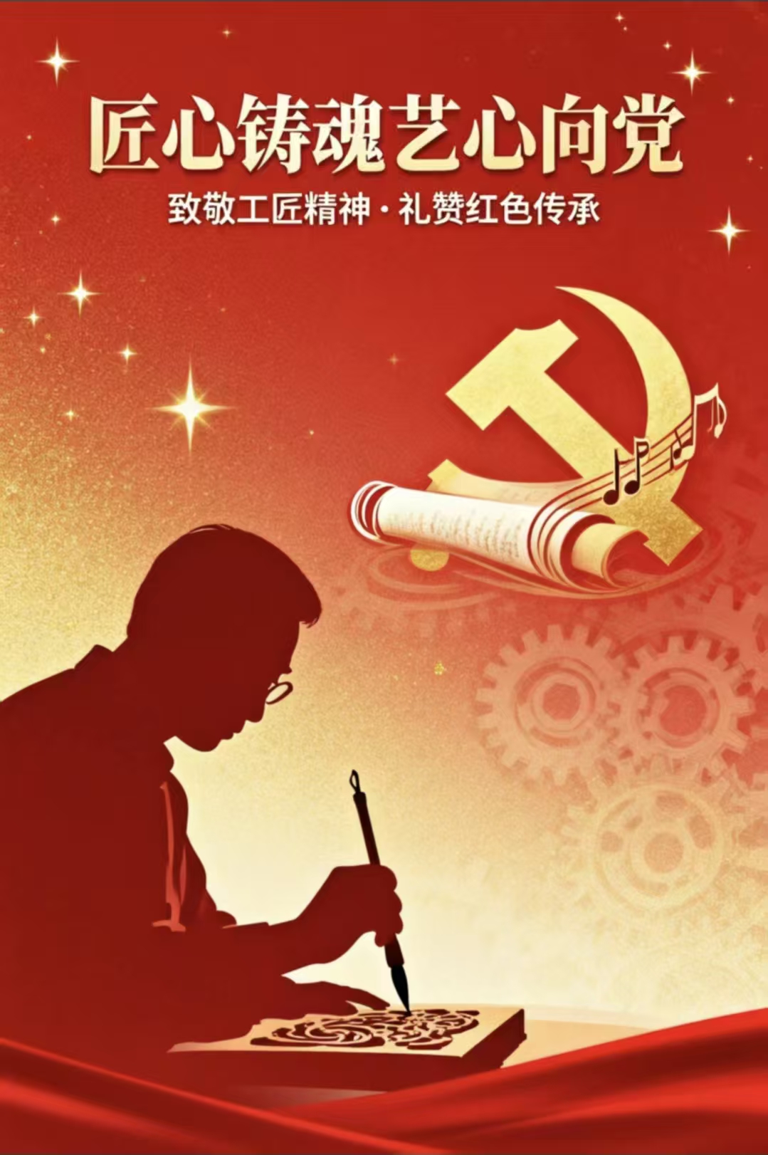 作品紧扣“匠心铸魂·艺心向党”主题,以红金渐变的视觉语言,诠释了艺术传承与红色精神的交融。画面中,创作者伏案雕刻的剪影,呼应着“致敬工匠精神”的内核,传递出以笔为剑、以刀为媒的创作坚守;党徽与乐谱、卷轴元素相衬,象征红色文化在艺术表达中的传承与创新;齿轮纹理与星光点缀,则寓意着时代发展中匠心的永恒价值。整体设计将“礼赞红色传承”的主题融入细腻的视觉符号,既是对工匠精神的致敬,也是艺术学子以匠心践行使命、绘就2026奋蓝图的精神宣言。