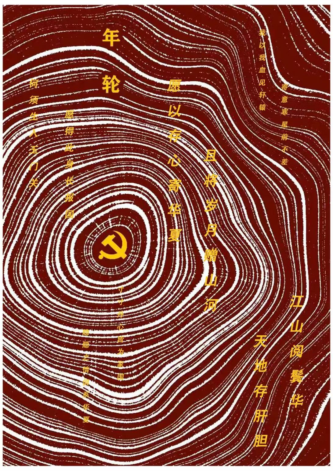 这幅《年轮》主题海报紧扣“匠心铸魂·艺心向党”的核心,以层层扩散的年轮纹理为视觉基底,暗喻党与国家发展的岁月沉淀。中心的党徽如根系般锚定画面,向外延展的线条如同时光脉络,承载着青年学子对家国的赤诚情怀。金色诗句与文案错落分布于纹理之间:“愿以存心寄华夏,且将岁月赠山河”“我以我血见轩辕”等语句,将个人理想与时代使命相融;“何须生入玉门关”“愿得此身长报国”等经典诗句,传递出青年传承红色基因的坚定信念。创作者以极简的红金配色与富有韵律的线条,诠释“以笔为剑”的创作理念,既是艺术学子对党的深情告白,也是他们绘就2026奋进蓝图、以青春守护家国的精神宣言。