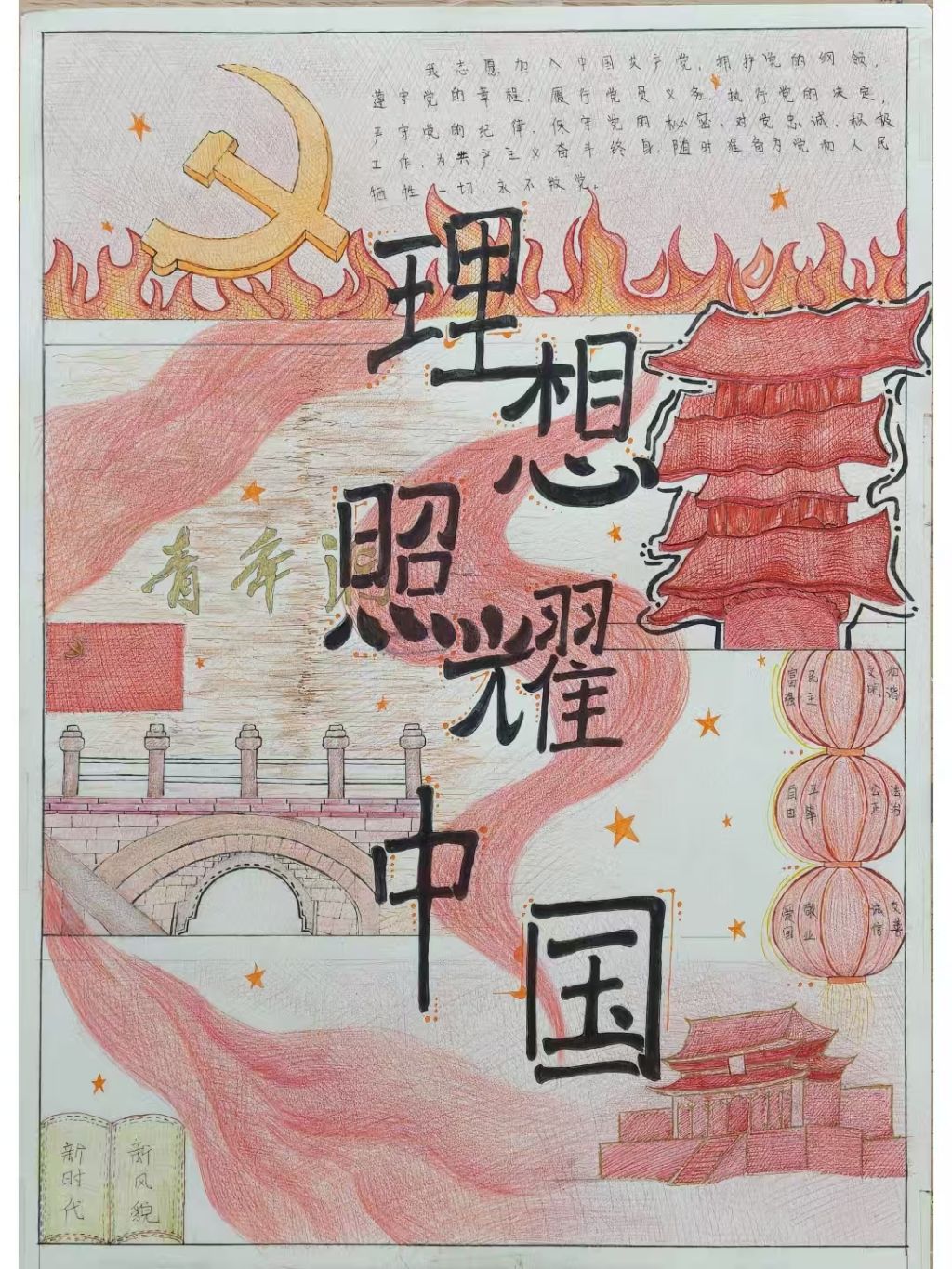 这幅手绘作品紧扣“匠心铸魂·艺心向党”主题,以“理想照耀中国”为核心视觉文案,用细腻的彩铅笔触勾勒出青年学子心中的奋进蓝图。画面顶部,党徽与火焰元素呼应着入党誓词的文字内容,传递出信仰的炽热力量;“青年”二字与飘扬的红绸相衬,点明青春担当;赵州桥、黄鹤楼、天安门等标志性建筑,串联起历史传承与当代发展的脉络;灯笼与“新时代 新风貌”的文案,则寄托着对家国繁荣的祈愿。创作者以手绘为媒介,将个人理想与时代使命相融,既是对党的深情告白,也是艺术学子以匠心践行使命、绘就2026奋进蓝图的青春宣言。