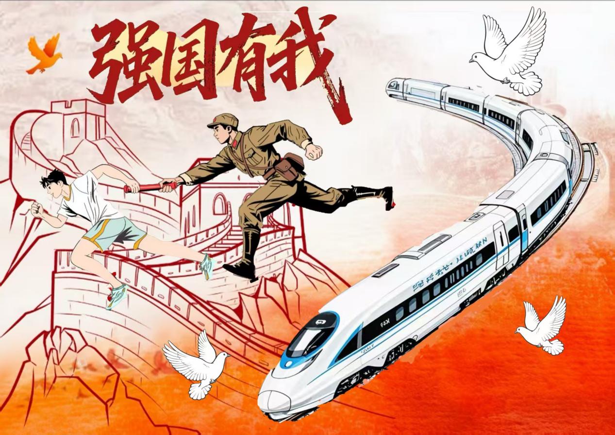 这幅插画紧扣“匠心铸魂·艺心向党”主题,以“强国有我”为核心,用充满动感的视觉叙事诠释了学子面向2026年的奋进蓝图。画面中,革命先辈与当代青年接力奔跑的剪影,象征红色精神的代代传承;蜿蜒的高铁如奋进的脉搏,呼应国家发展的速度;长城与白鸽元素锚定家国守护与和平发展的内核。创作者以现代插画语言,将历史传承与时代使命相融,既是对先辈的致敬,也是当代青年“以笔为剑、以行践诺”,奔赴新征程的青春宣言。