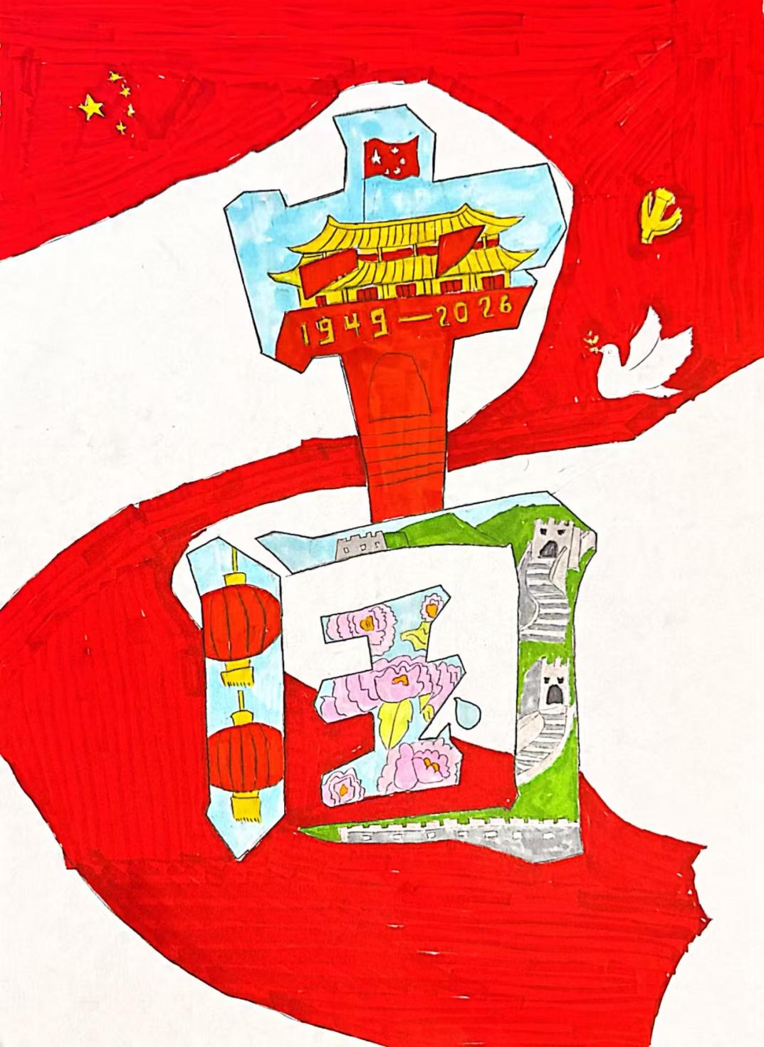 这幅以“匠心铸魂·艺心向党”为主题的作品,以“中国”二字为核心视觉框架,用拼贴与手绘结合的方式,绘就艺术学子面向2026年的奋进蓝图。“中”字融入天安门城楼意象,标注“1949—2026”的时间线,串联起国家发展的历程;“国”字内嵌长城、红灯笼与盛放的牡丹,既展现山河锦绣的家国图景,也寄托着对繁荣昌盛的祈愿。飘扬的五星红旗与红绸贯穿画面,传递出青年学子炽热的爱党爱国情怀。创作者以充满巧思的文字造型,将个人艺术追求与时代使命相联结,用画笔诠释“以笔为剑”的青春担当,既是对党的深情致敬,也是艺术学子奔赴新征程的奋进宣言。