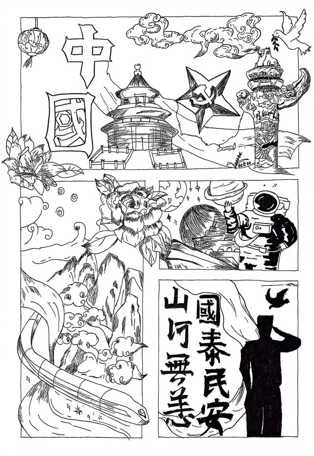 这幅黑白线稿作品紧扣“匠心铸魂·艺心向党”主题,以多格拼贴的叙事方式,勾勒出艺术学子心中的2026奋进蓝图。画面上方,“中国”二字与天坛、华表、五角星等标志性元素呼应,锚定家国情怀的核心;中间格的牡丹、航天员与山河意象,分别对应文化传承、科技突破与家国守护;右下角“国泰民安”“山河无恙”的书法文字与军人剪影,传递出青年对家国安宁的祈愿与担当。创作者以细腻的线条与丰富的视觉符号,将个人艺术追求融入时代语境,既是对党的深情致敬,也是艺术学子以笔为剑、奔赴新征程的青春宣言。