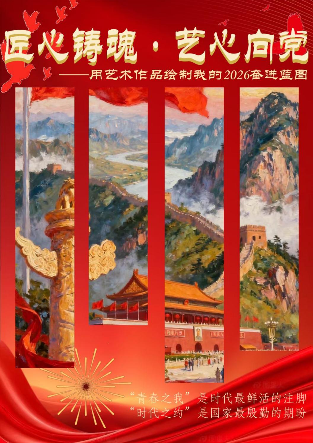 《匠心铸魂·艺心向党》主题作品,以热烈的红色为主基调,用四幅纵向油画拼接成一幅完整的家国图景,既饱含艺术学子的赤诚情怀,也勾勒出2026年的奋进蓝图。画面左侧,金色华表傲然挺立,祥云纹饰承载着对中华文脉赓续的敬意;延展的画幅里,天安门城楼庄严矗立,红旗猎猎,传递着青年一代对祖国的深厚热爱;远处长城如巨龙盘踞群山,层峦叠嶂间尽显山河壮丽,寓意着民族精神的坚韧不屈。飘扬的红绸与飞鸟元素贯穿画面,让静态的山河涌动着蓬勃生机。作品以“以笔为剑”的创作理念,将青春理想融入家国叙事,用细腻的笔触与浓烈的色彩,诠释了“青春之我”与“时代之约”的深刻联结,既是艺术学子向党和祖国的深情告白,也是他们以匠心践行使命、以艺心奔赴未来的奋进宣言。
