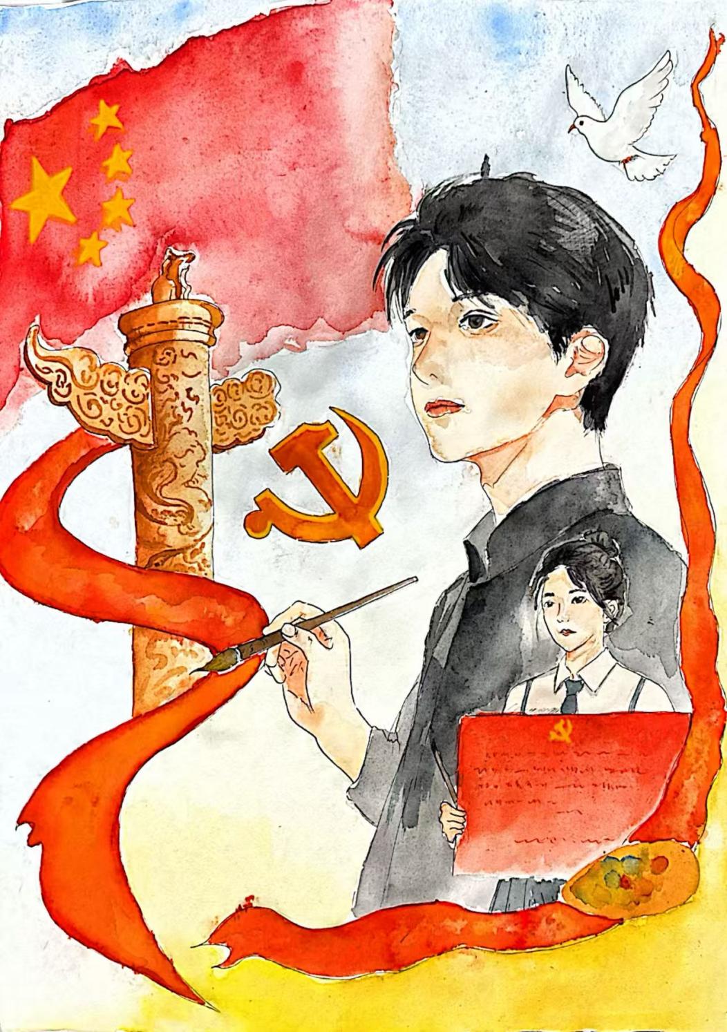 鹿钰捷这幅水彩作品以“匠心铸魂·艺心向党”为主题,勾勒出艺术学子以笔为剑、绘就2026奋进蓝图的青春姿态。画面中,青年学子手持画笔立于中央,身后浮现的同伴形象,呼应着青年一代携手同行的奋进群像;华表、党旗、五星红旗等元素,锚定了爱党爱国的精神内核,红绸如涌动的热血缠绕其间,白鸽展翅象征着对和平与未来的期许。创作者以细腻的水彩笔触,将个人理想与时代使命相融,用画笔传递“青春之我”的蓬勃力量,既是艺术学子对党的深情告白,也是他们以匠心践行使命、以艺心奔赴2026新征程的生动宣言。