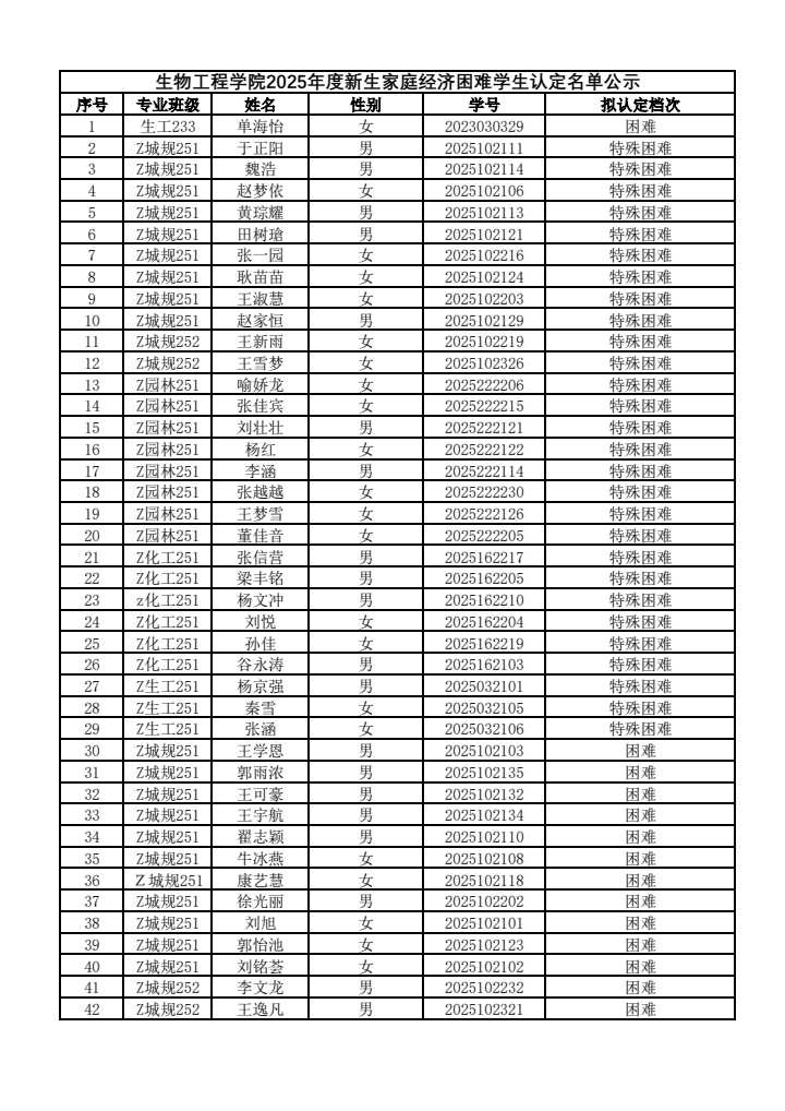 经学生本人申请、各班级认定评议小组民主评议、生物工程学院家庭经济困难学生认定工作组审核确认,现将2025—2026学年新生家庭经济困难学生认定结果进行公示。