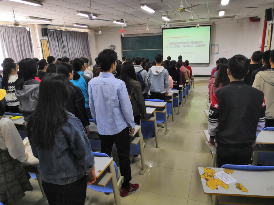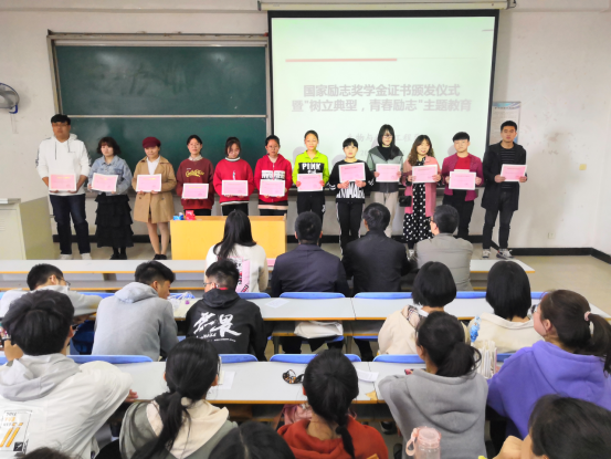 活动伊始,全体起立奏国歌。会上,邱月盈首先讲述了此次活动的目的与意义,随后所有参会老师为获奖学生颁发国家励志奖学金荣誉证书,并对获奖学生表示祝贺。紧接着大四获奖学生代表李腾分享了自己考研的成功经验,强调了英语对考研的重要性,鼓励同学们努力学习英语,做到课前预习,课后复习;大三获奖学生代表段玉对自己目前的学习和工作情况进行总结,提醒同学们要合理分配学习与工作时间,不忘初心,做最初的自己。最后,邱月盈指出我们要以优秀学生为榜样,在以后的学习和工作中争取取得更大的进步,告诫同学们在学习中要树立目标,有计划、有目的的进行学习,并强调应注重学习文化知识与社会实践相结合,提高自身文化知识的同时也要增强社会技能。本次会议圆满结束。