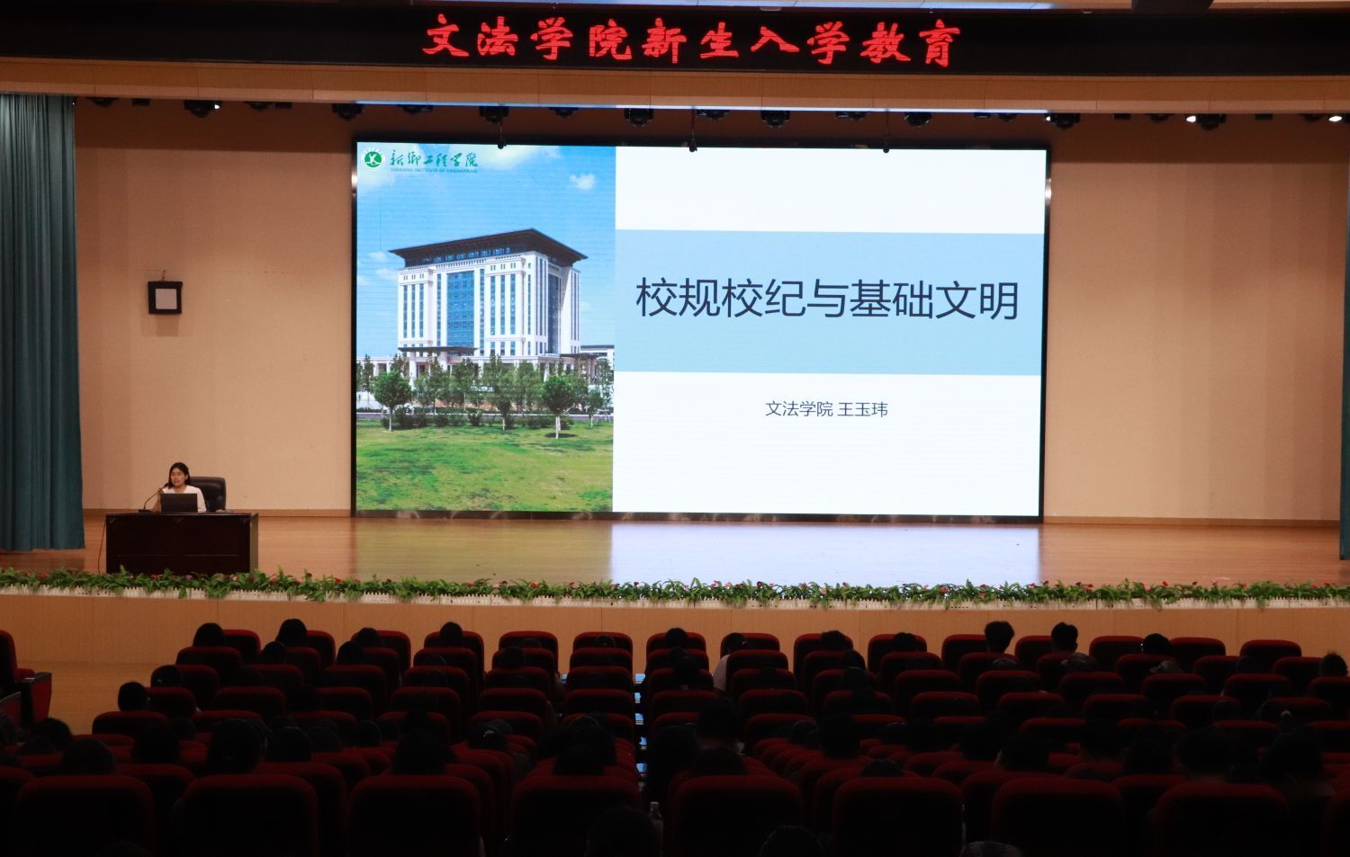 为助力文法学院新生顺利开启大学生活,精准把握行为准则,我院于9月16日在文渊楼报告厅开展新生入学教育活动,2025级全体新生参加。其中,“校规校纪与基础文明”专题由辅导员王玉玮主讲。