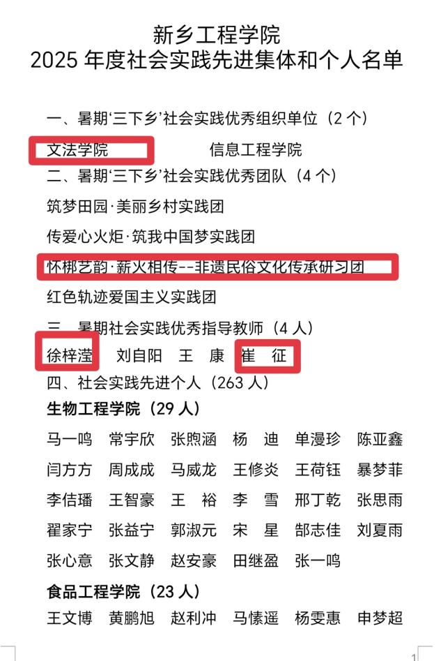 集体层面,我院连续两年获评“社会实践优秀组织单位”,充分体现学校对我院社会实践工作的高度认可;团队层面,“怀梆艺韵·薪火相传—非遗民俗文化传承研习团”团队,聚焦怀梆非遗民俗文化的保护与传承,通过深入调研、实践推广等系列行动,连续两年获评“社会实践优秀团队”;个人层面,徐梓滢、崔征老师因指导有力、成效显著,荣获“优秀指导老师”称号,另有张宁、张苗苗、薛雨洁等33名同学凭借实践中的积极表现与突出实绩,获评“社会实践先进个人”