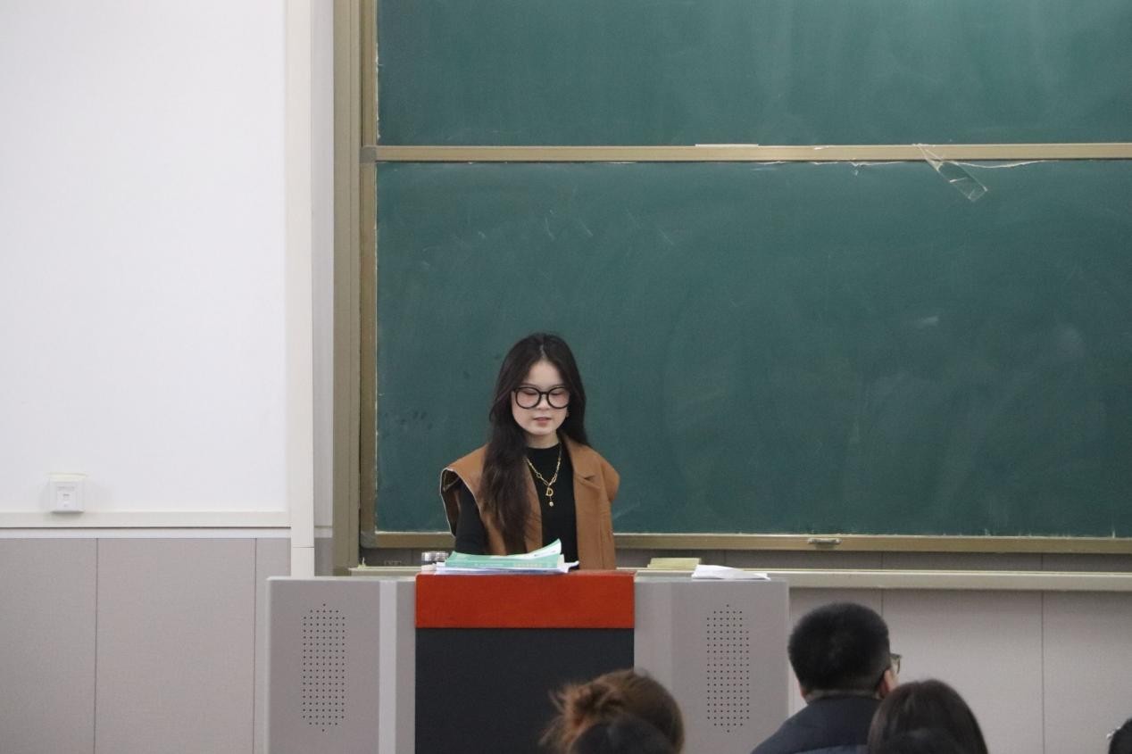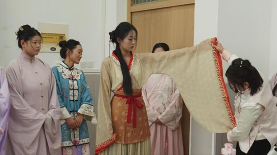 接着,活动进入了极具互动性的汉服展示环节。罗艳娟邀请身着不同款式汉服的同学走上讲台,将课堂知识与实物展示巧妙结合。针对每位同学所穿的汉服款式——无论是曲裾深衣的庄重典雅,还是齐胸襦裙的灵动俏皮,亦或是直裾袍的简洁大气,罗艳娟都进行了针对性的讲解与知识回顾。同时,她还引导大家聚焦于汉服的纹饰与色彩所体现的象征寓意——精致的云纹象征着吉祥如意,威严的龙纹代表着权力与等级,淡雅的青、蓝、白等色彩则体现了不同时代的审美偏好。同学们围绕着汉服积极提问,在观察与交流中,同学们对汉字与服饰文化的关联有了更深入的理解。
