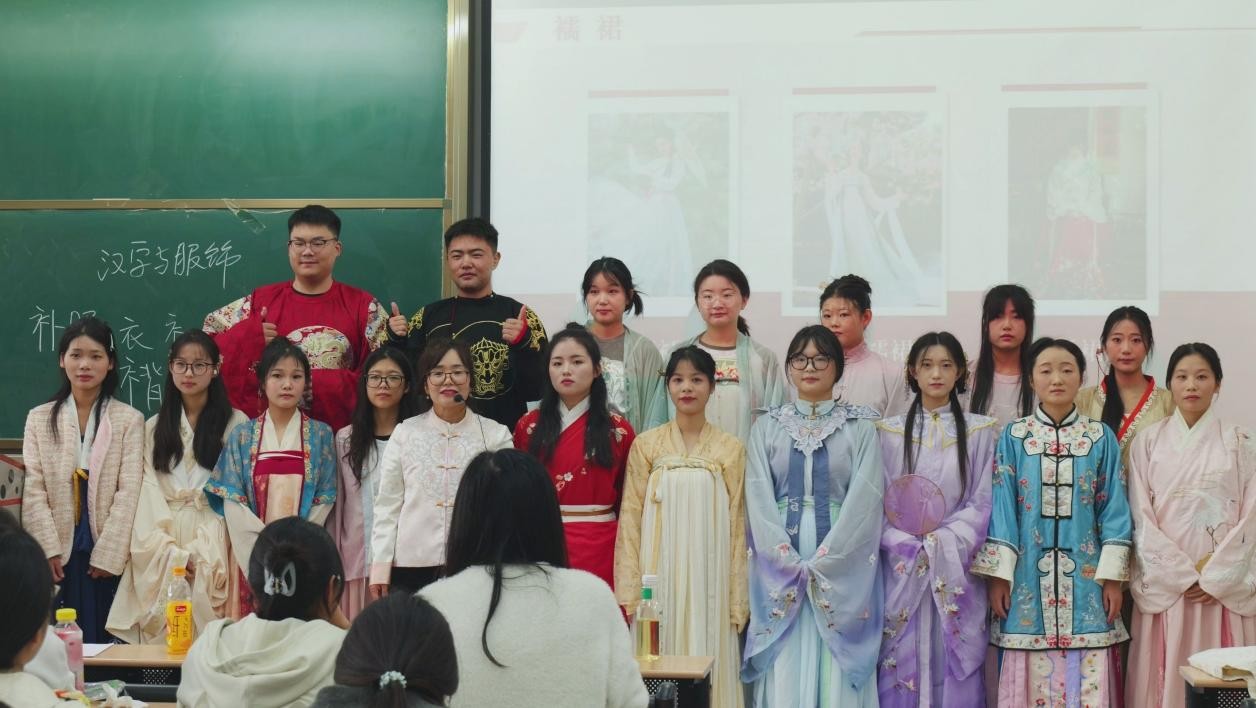 为破解汉字背后深厚的文化密码,探索课堂教学模式的创新路径,10月15日上午,中文专业学生于学院楼B-203教室共同参与了一场以“汉字与服饰”为主题的课堂创新活动。在汉服的锦绣与汉字的墨香中,同学们体验了汉字与传统服饰文化的神奇链接。
