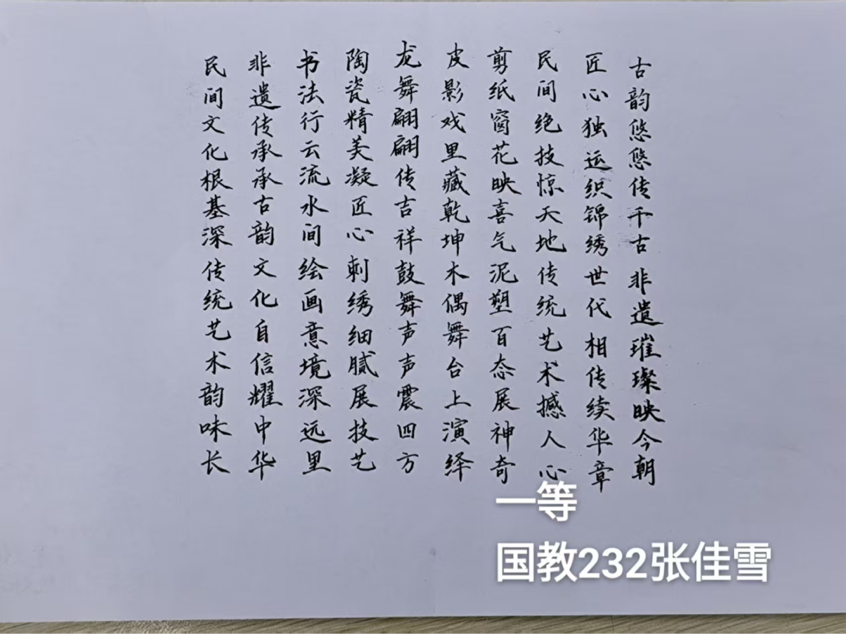 本次比赛围绕“先进文化”“传统文化”“法治文化”三大主题展开,现场参赛选手皆静气凝神、专注书写,将师范生技能培训的阶段性成果直观呈现在笔墨之间。硬笔作品结构工整、笔法精妙,既展现出日常硬笔书写训练的扎实功底,也贴合未来备课、作业批改等教学场景所需的核心要求;毛笔作品行笔流畅、气韵生动,既体现出传统文化素养与书法技能培训的双重成效,也为日后开展文化类教学积累了实践经验。这些作品或展现新时代青年精神风貌,或传递对法治精神的深刻理解,不仅实现了文化传承与书法艺术的有机融合,更验证了技能培训中“书写与教学内容结合”理念的有效性,充分彰显出师范生将书写技能转化为教学能力的良好潜力。