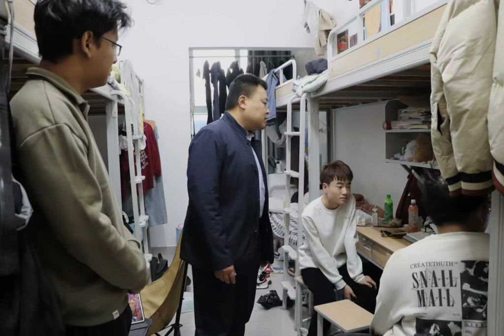 检查过程中,检查组对各楼层宿舍的卫生状况与安全设施进行了全面检查,重点排查用电规范、消防通道畅通情况等关键环节。在低楼层区域,辅导员们仔细查看墙面、地面的防潮状况,要求同学们做好日常通风,注意个人物品防霉防潮。在高楼层宿舍,辅导员们特别强调开窗安全规范,提醒同学们杜绝高空坠物隐患。检查期间,老师们还关注学生的作息规律问题。张振华书记表示,良好的作息习惯不仅有助于提高学习效率,更是保持身心健康的重要基础。