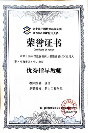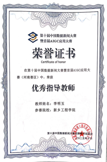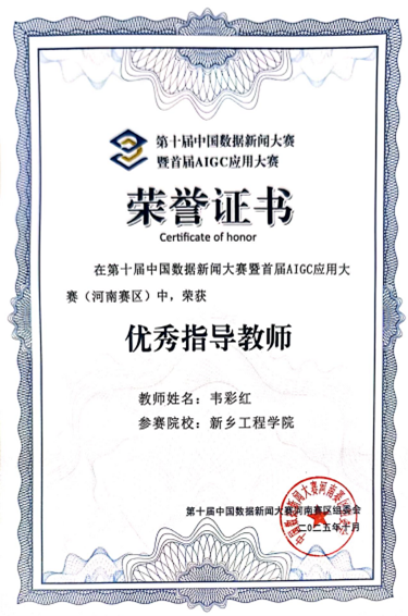 近日,第十届中国数据新闻大赛暨首届AIGC应用大赛(河南赛区)决赛颁奖典礼在郑州经贸学院落幕,我校新闻学2023级学生董明远、郑佳茵、李佳、任婷婷团队在教师韦彩红、李明玉、段洁的指导下,携作品《不止“罕见”生命的另一种刻度》摘得河南省赛数据新闻赛道决赛“三等奖”,指导教师韦彩红、李明玉、段洁同步获评“优秀指导教师”。