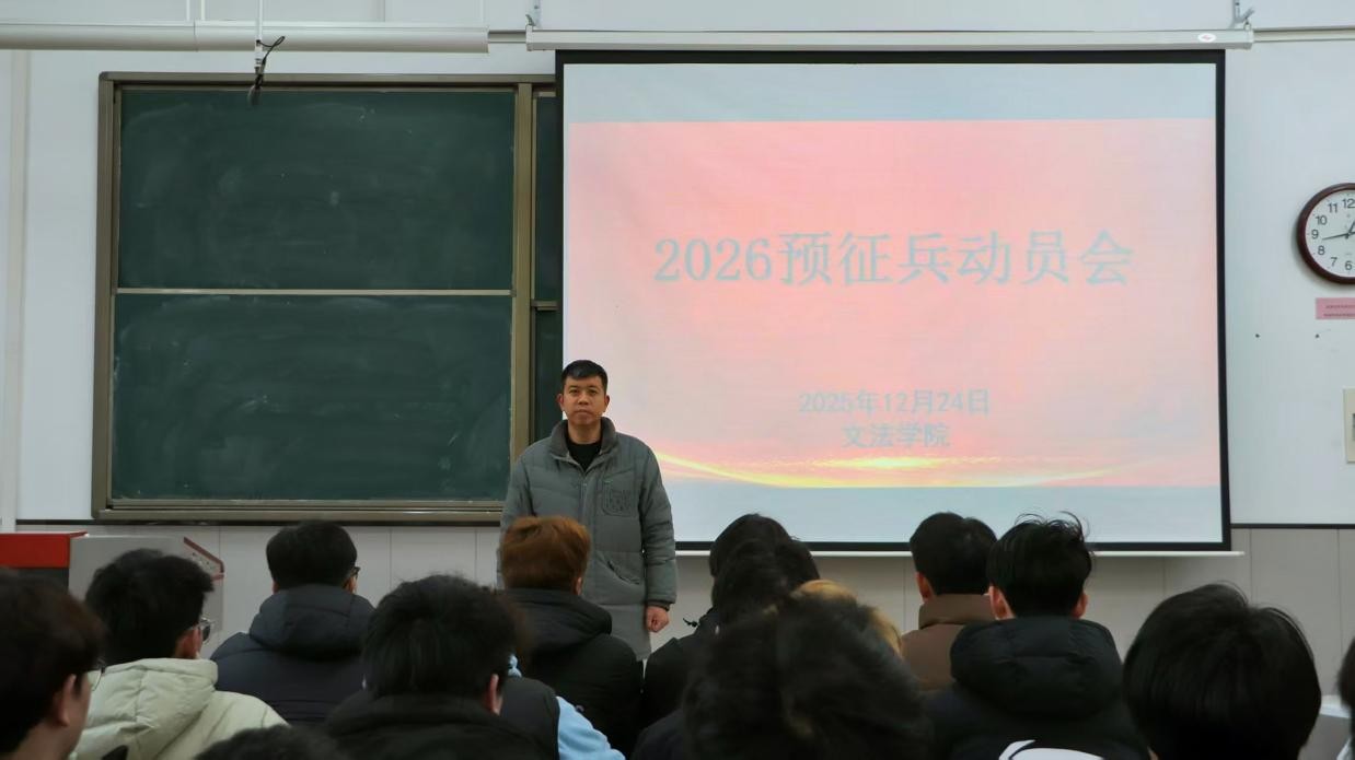 为进一步落实春季征兵工作部署,帮助我院学生全面了解征兵政策、明晰参军报名与入伍流程,文法学院于12月24日在南校区学院楼B-103教室组织举办了2026年预征兵动员会。动员会重点解读3月份征兵安排、预征报名规则及各类参军优惠政策,为有意向参军的学子答疑解惑。