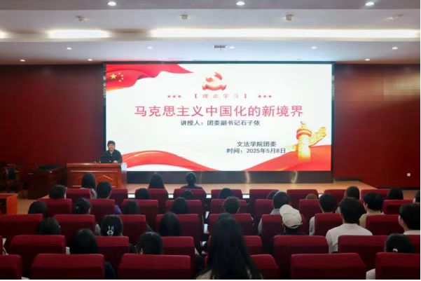 为深化学生对马克思主义中国化理论的理解与认识,筑牢理想信念根基,同时引导青年学生准确把握时代脉搏、明晰使命担当。2025年5月8日,文法学院团委于X2报告厅举办“马克思主义中国化的新境界”理论学习讲座。本次讲座由学院团委副书记石子依担任主讲人,文法学院全体青马工程学员参加。