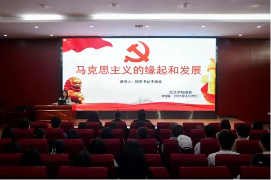 为深化青年理论武装,夯实马克思主义理论根基,2025年4月29日,文法学院团委于X2报告厅举办“马克思主义的缘起和发展”主题讲座。本次讲座由学院团委书记李婉鑫主讲,文法学院全体青马工程学员参与。