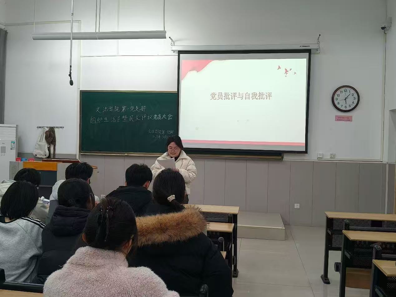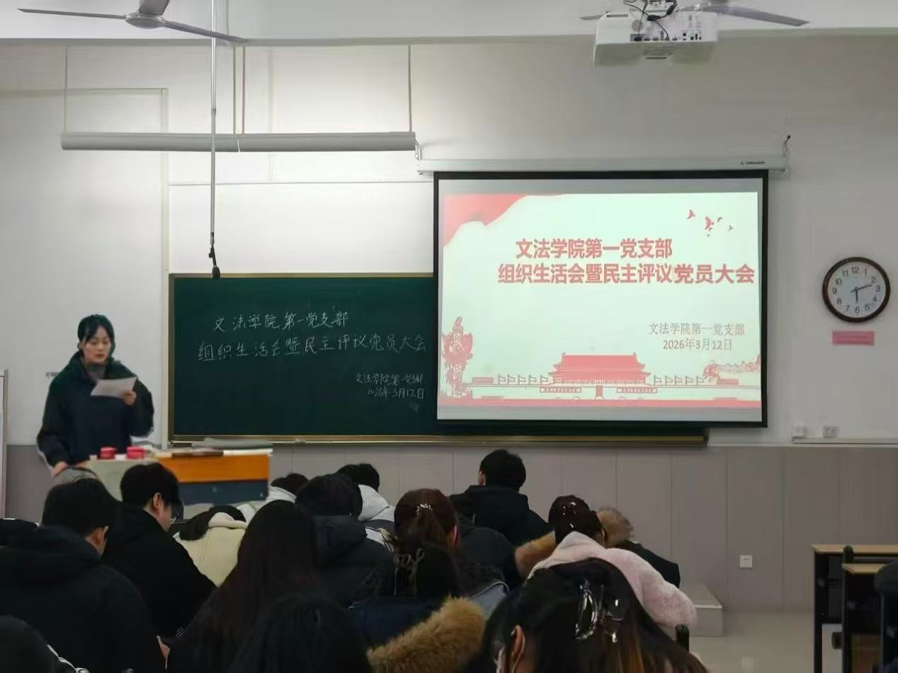 为深入贯彻新时代党的建设总要求,持续深化党的创新理论武装,严格落实党内组织生活制度,全面提升支部党员党性修养与支部凝聚力、战斗力,文法学院第一党支部于2026年3月12日在学院楼B107召开组织生活会暨民主评议党员大会。此次会议由党支部书记赵淑媛同志主持,第一党支部全体党员及预备党员参加会议。