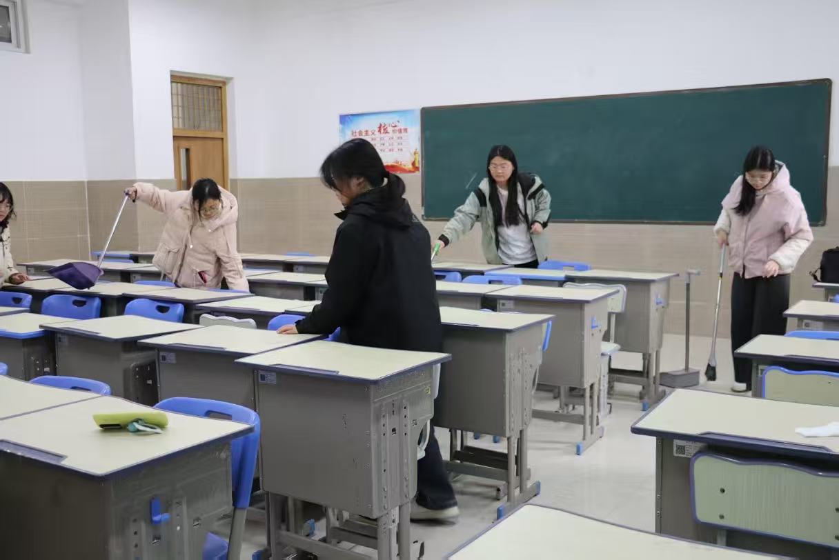 活动开始前,负责人明确了劳动纪律与安全注意事项,确保各项工作有序推进。志愿者们携带抹布、扫帚、垃圾袋等工具,以小组为单位对教室地面、桌椅、讲台、黑板、门窗等区域展开全面清扫。志愿者们分工明确、配合默契,有的仔细擦拭桌面与讲台的浮尘,有的认真清理黑板槽内的粉笔灰,有的弯腰捡拾地面纸屑与杂物,并对门框、窗台等卫生死角进行了重点清理。清扫过程中,志愿者们始终热情饱满,并严格按照垃圾分类要求将杂物投放至指定容器,充分展现了文法学院学子良好的精神风貌与强烈的责任担当。
