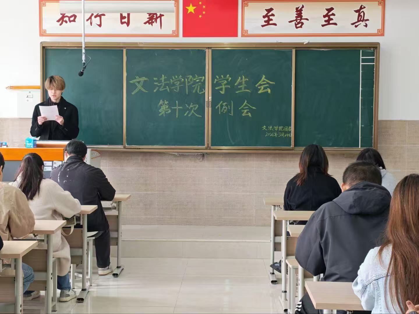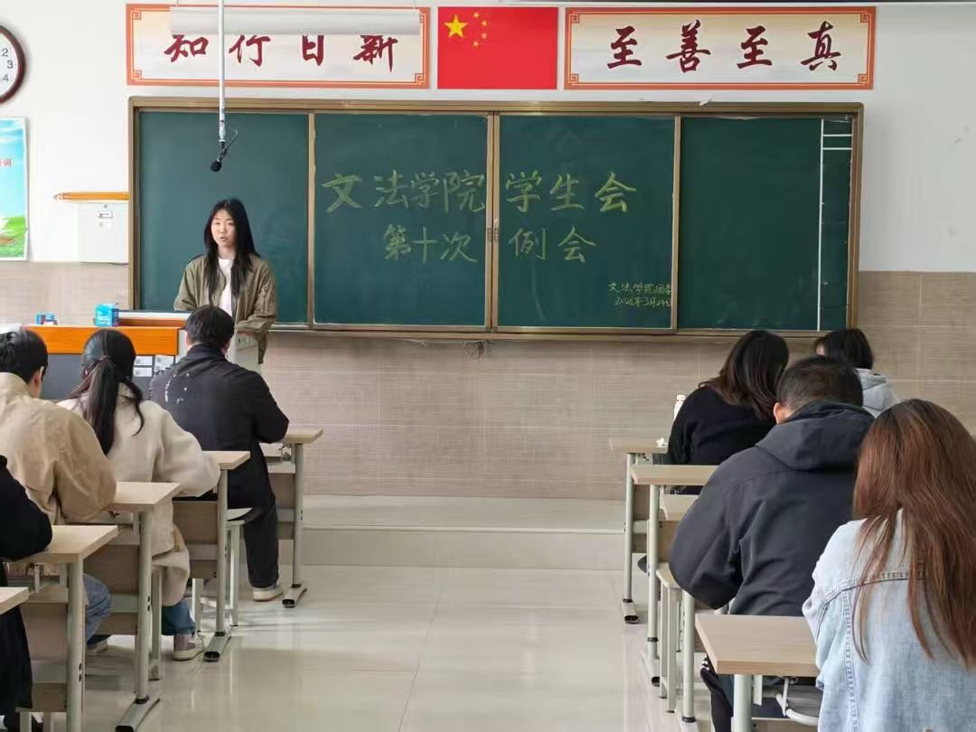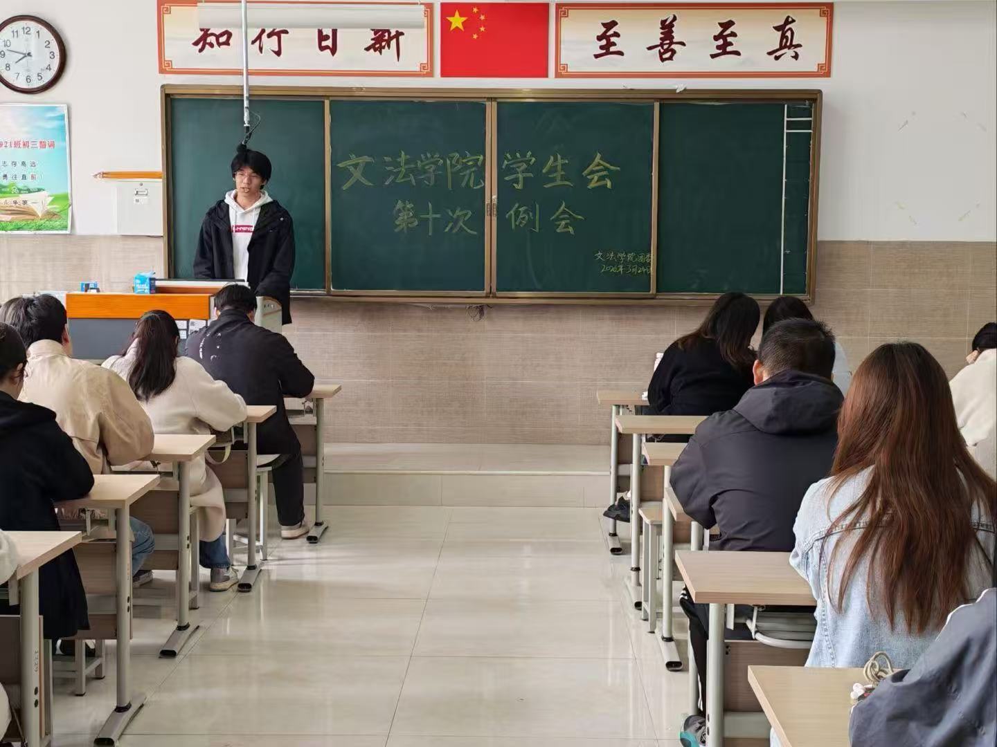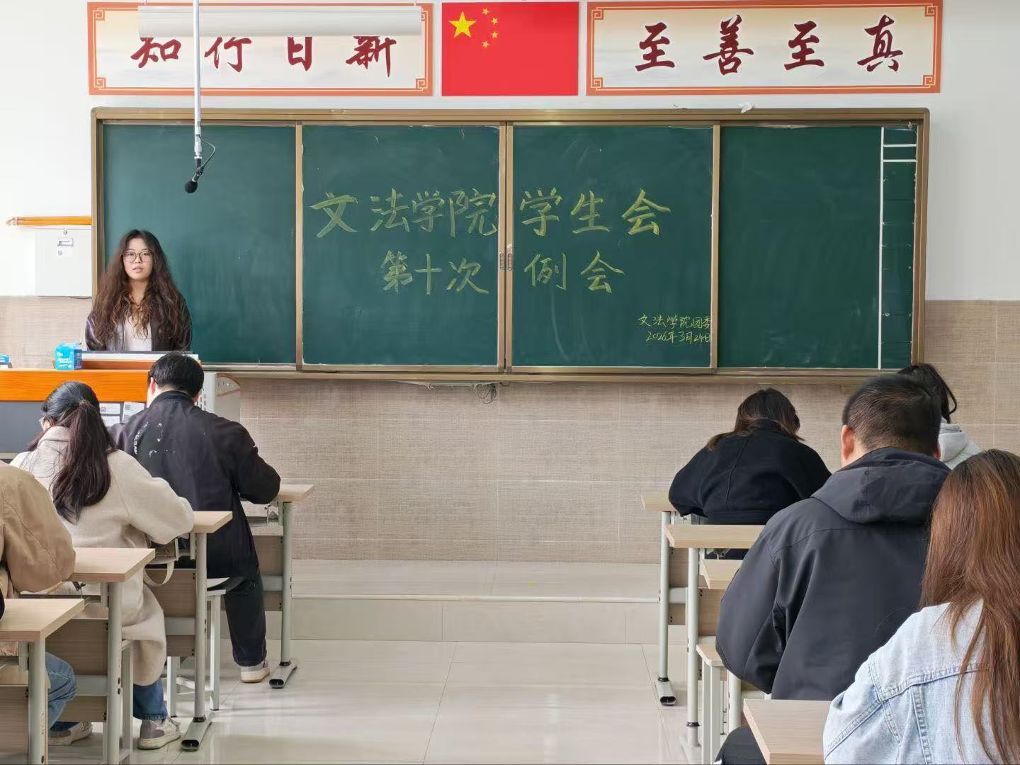 宣传部潘书义介绍,学生会第十次例会黑板字书写已完成;“笔绘法治画卷,心筑法治长城”及“弘扬雷锋精神,传承榜样力量”活动正在推进。