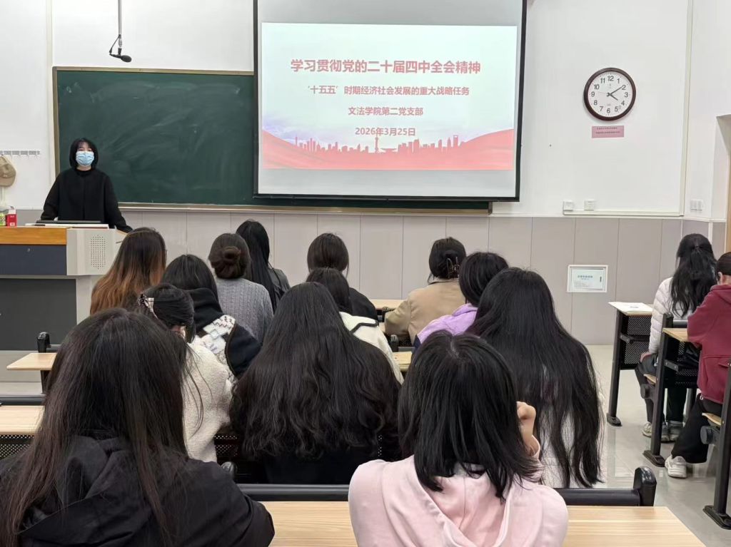 为深入学习贯彻党的二十届四中全会精神,准确把握“十五五”时期经济社会发展的重大战略任务,文法学院第二党支部于3月25日在学院楼B-108组织召开专题学习会议暨学习研讨会。马智慧同志主持会议,支部全体党员参加。