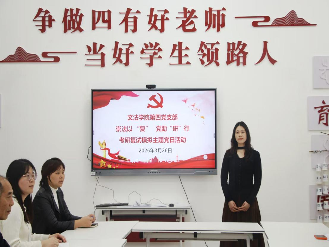 此次考研复试模拟主题党日活动,既为考研学子搭建了专业化实战指导平台,也彰显了党支部服务师生、凝心聚力的育人初心,推动党建工作与学生学业发展深度融合、同频共振。下一步,文法学院第四党支部将持续聚焦学生成长需求,丰富活动载体、整合优质师资力量,以暖心党建服务助力学子圆梦考研,为学院考研工作高质量推进提供坚实保障。