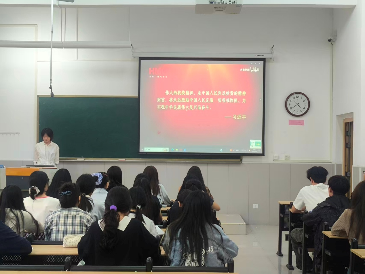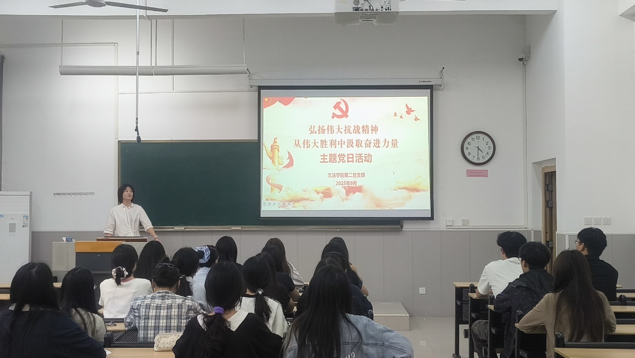 为深入贯彻落实习近平总书记关于弘扬伟大抗战精神的重要指示精神,进一步激发党员干部的爱国热情和奋斗精神,9月25日,文法学院第二党支部在学院楼B-107组织开展了以“弘扬伟大抗战精神 从伟大胜利中汲取奋进力量”为主题的党日活动,组织全体党员观看了纪录片《烽火中原》。此次活动旨在通过回顾河南抗战历史,让党员们深刻感受伟大抗战精神的内涵,汲取前进的智慧和力量。本次活动由马智慧老师主持,文法学院第二党支部全体党员参加。