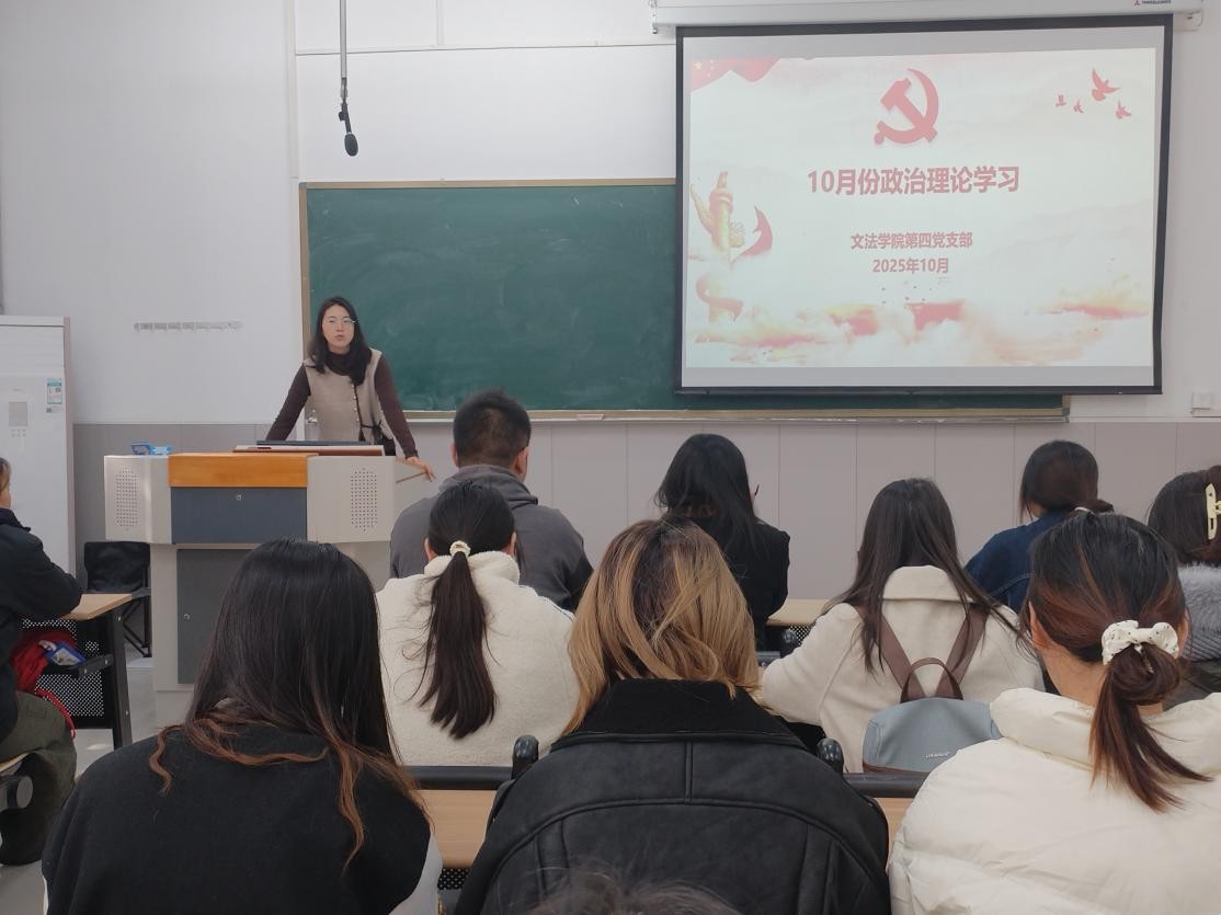 为深入学习领会党的二十届四中全会精神实质,切实把支部党员思想和行动统一到党中央决策部署上来。2025年10月28日,文法学院第四党支部在学院楼B107开展专题学习会议。会议由支部书记吕鹏洁老师主持,第四党支部全体正式党员及预备党员参加。