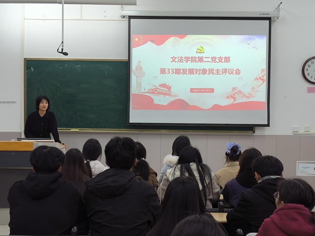 为严格党员发展程序,把好党员入口关,提升党员发展质量,文法学院第二党支部10月30日于学院楼B-108顺利召开了第33期发展对象民主评议会。本次会议由马智慧老师主持,支部全体成员共同参加。