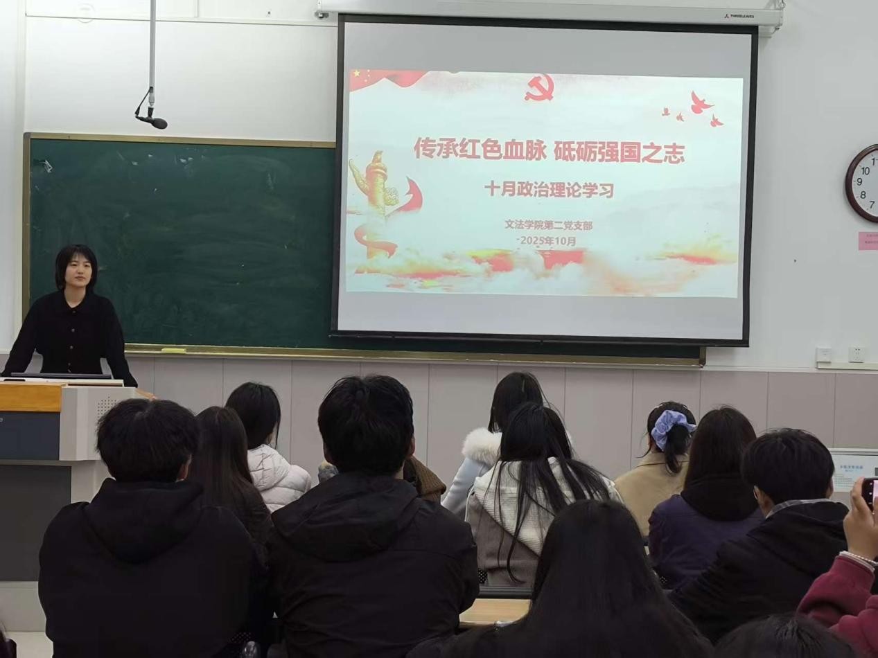 为深入贯彻落实党中央关于加强政治理论学习的要求,传承红色基因、赓续红色血脉,文法学院第二支部于10月30日在学院楼B-108成功组织了10月份政治理论学习会议。本次会议聚焦学习习近平总书记在庆祝中华人民共和国成立76周年招待会上的重要讲话精神、关于中华民族伟大复兴及中华民族共同体的重要论述。支部全体成员参与学习。