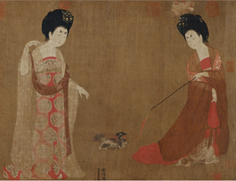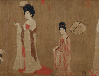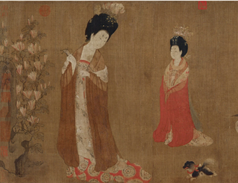 《簪花仕女图》是唐代仕女画中的旷世杰作,现藏于辽宁省博物馆。此长卷描绘了春夏之交,五位簪花贵族女子与一名侍女在庭院中漫步、赏花、戏犬、赏鹤的闲适场景。
