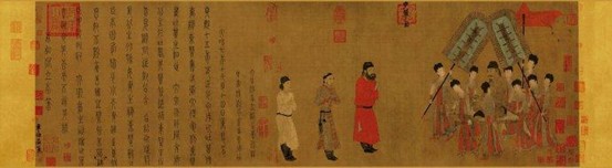 画面布局极具巧思——右侧唐太宗李世民端坐步辇,威严中带着亲和,由九名宫女抬辇执扇,簇拥而行。左侧三人依次排列:红袍虬须的礼官引导、身着民族服饰的禄东赞恭敬行礼、白衣执笏的译员紧随其后。这种右密左疏、右主左宾的构图,通过人物大小、位置和密度的对比,自然凸显了唐太宗的中心地位,体现了画家对权力秩序的精准把握。
