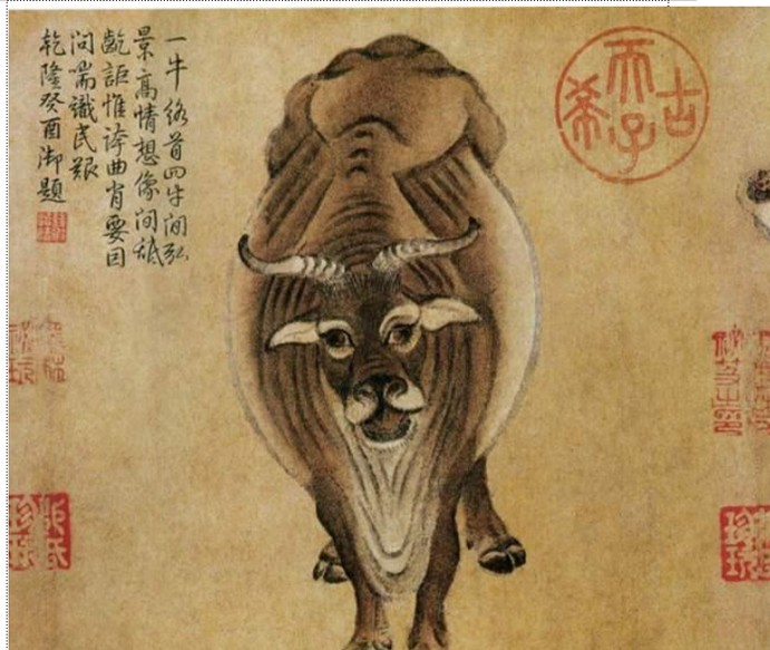 《五牛图》是中国十大传世名画,少数几件唐代传世纸绢画作品真迹之一,也是现存最古的纸本中国画。在横卷上画了五条神态、性格、年龄各异的牛。从右至左,首匹为棕色老牛,描绘成一边咬着东西一边在杂木旁蹭痒痒的情状,意态悠闲;次为黑白杂花牛,身躯壮大,翘首摇尾,步履稳健;第三匹为深赭色老牛,筋骨嶙峋,纵峙而鸣,白嘴皓眉,老态龙钟;第四匹为黄牛,躯体高大,峻角耸立,回首而顾;第五匹牛,络首而立,体态丰厚,凝神若有所思,双眼流琢出倔强的个性。