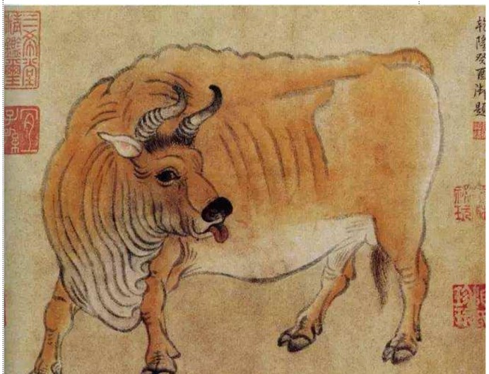 在技巧的运用上,画家用粗壮有力的墨线勾勒牛的轮廓,表现出牛的强健、沉稳和行动迟缓。尤其是对牛的眼睛、鼻子、蹄趾、毛须等部位的着意渲染,更凸显出牛有力劲健的筋骨和质感真实的皮毛,画面在用色上也很有特点,深褐色、黄色、黑白,代表着最典型的牛的毛色,虽然只用了少许颜色,却给人丰富多彩的感觉。