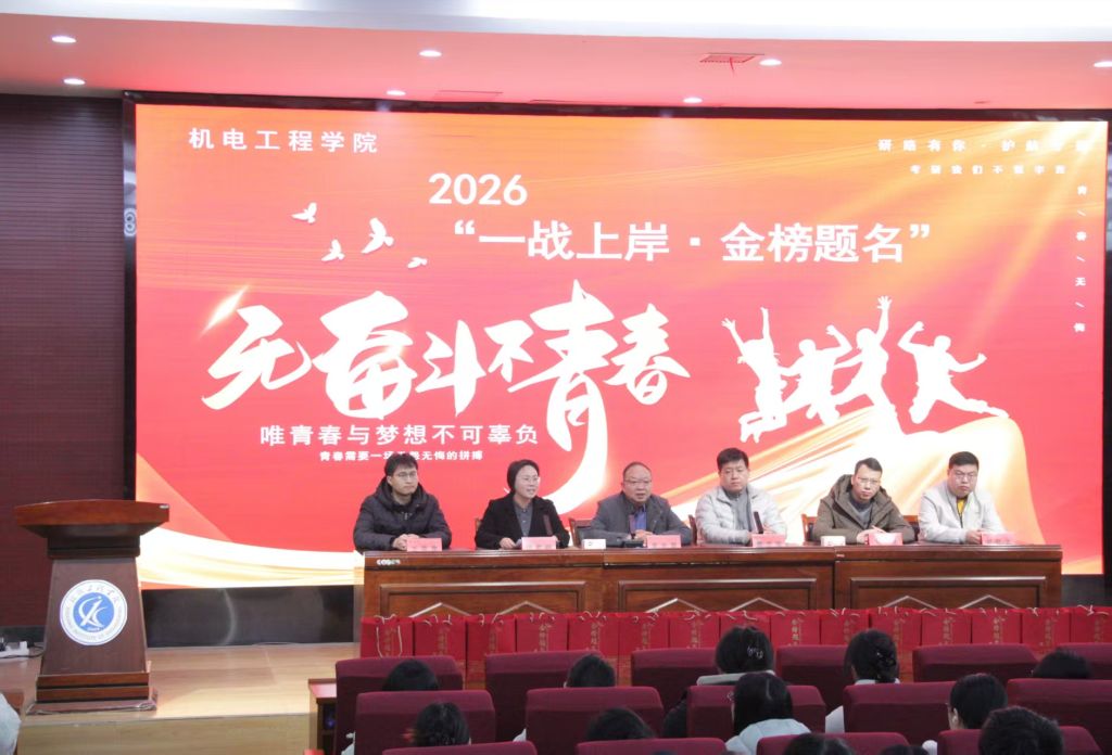 凛冬虽寒,研途暖心。临近考研冲刺关键节点,为切实缓解学子备考压力,传递学院关怀与期许,凝聚奋进力量,近日,机电工程学院2026届考研加油会在学院报告厅顺利举行。学院院长高金辉、常务副院长廖志雄、党委副书记郑俊珂、副院长张建、团委书记王筱铮、办公室主任刘红文和毕业生辅导员与全体考研学子齐聚一堂,以真挚关怀赋能逐梦之路,用殷切嘱托点燃冲刺斗志,为学子们送上冬日里的暖心助力。