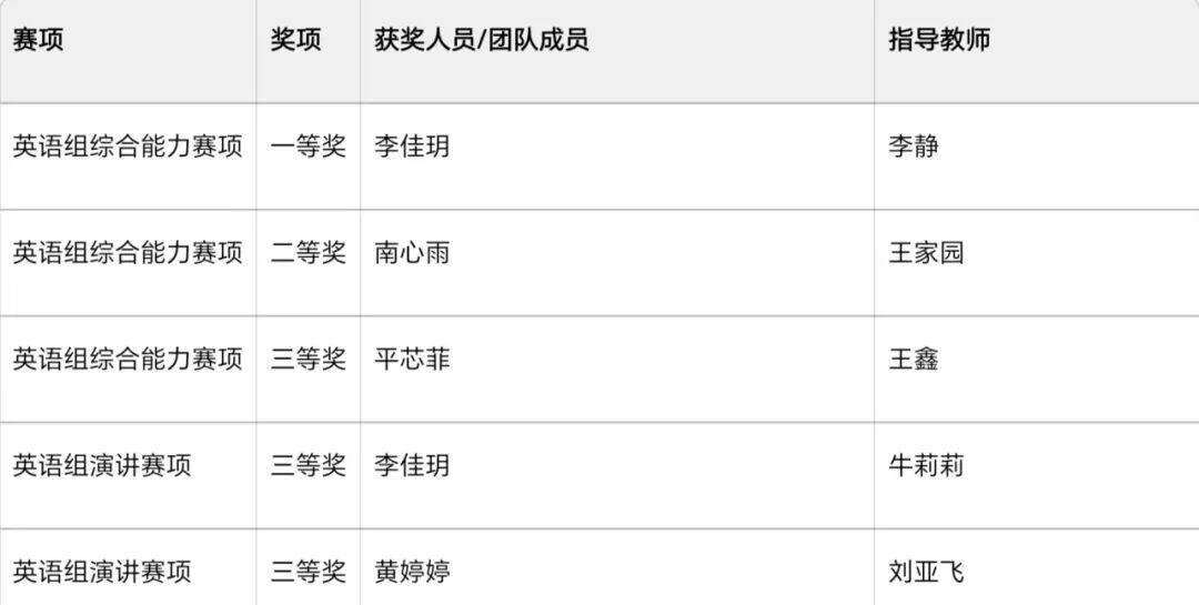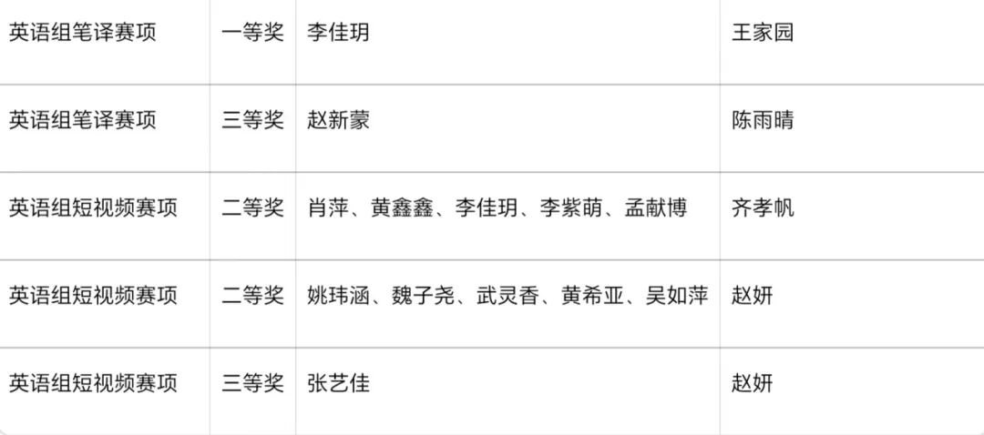 具体获奖情况如下:李佳玥同学表现最为突出,获得了英语组综合能力赛项一等奖、英语组笔译赛项一等奖及英语组演讲赛项三等奖三项奖项。南心雨同学荣获综合能力赛项二等奖。平芯菲、黄婷婷、赵新蒙三位同学分获综合能力赛项三等奖、演讲赛项三等奖及笔译赛项三等奖。在英语组短视频赛项中,由肖萍、黄鑫鑫、李佳玥、李紫萌、孟献博组成的团队以及由姚玮涵、魏子尧、武灵香、黄希亚、吴如萍组成的团队均荣获二等奖;张艺佳同学获得该赛项个人三等奖。