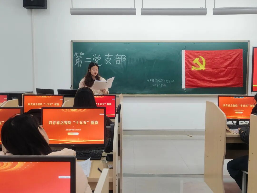 为深入学习贯彻党的二十届四中全会精神,落实全会关于推进“十五五”规划高质量实施的部署要求,引导青年党员将个人理想融入国家发展大局,2025年12月2日,外国语学院第二党支部在教学楼2语音室1开展“以青春之智绘‘十五五’新篇”专题党课。党课由支部书记范嘉欣主持,支部全体党员参与学习。