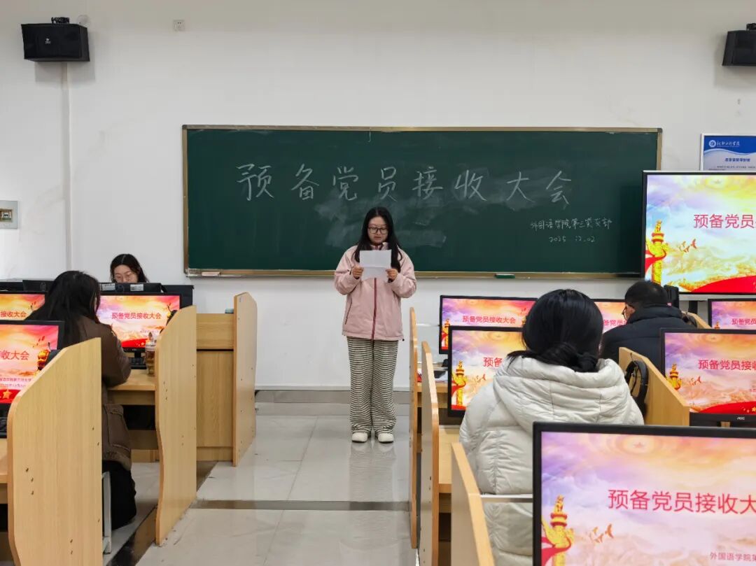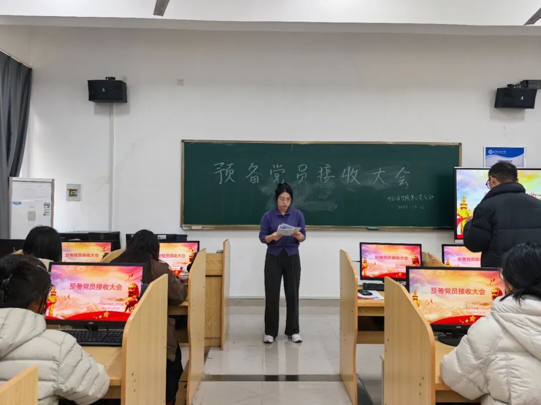 为进一步加强党员队伍为进一步加强党员队伍建设,切实提高党员发展质量,激发党组织的生机与活力,外国语学院第三党支部于2025年12月2日在教学楼二语音室4教室开展预备党员接收大会,会议由支部书记崔亚莉主持,全体党员参会。
