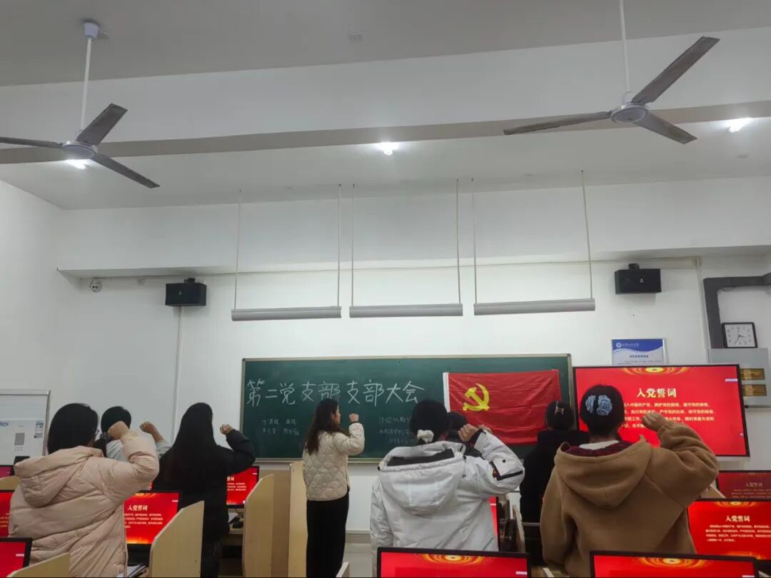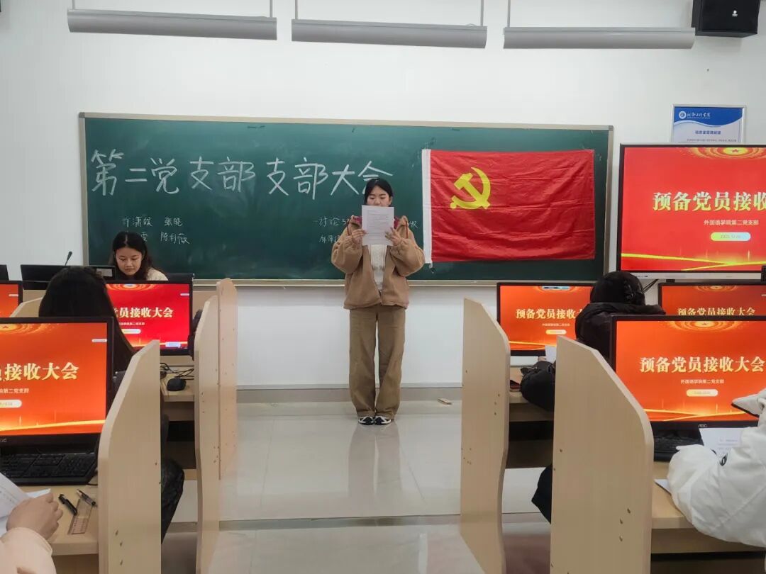 为进一步壮大党员队伍,筑牢党组织战斗堡垒,凝聚青年奋进力量,外国语学院第二党支部于2025 年 12 月 2 日在教学楼 2 语音室 1 召开预备党员接收大会。会议由支部书记范嘉欣同志主持,支部全体党员及许潇娱等4名发展对象参会。