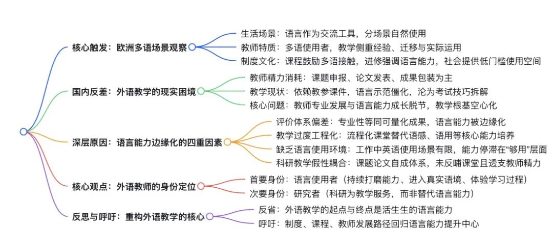欧洲的多语环境并非简单“天赋优势”,而是长期制度与文化选择的结果:课程设置鼓励多语接触,教师进修强调语言能力本身,即我们俗称的"看家本领",社会为语言使用提供了真实而低门槛的空间。反观现状,我们的外语教育体系,过急于用可量化的科研指标证明“专业性”,却在不知不觉中削弱了语言教师最核心的专业资本——语言本身。我们对老一辈外语教师的敬佩不正是因为他们有扎实的外语功底吗?