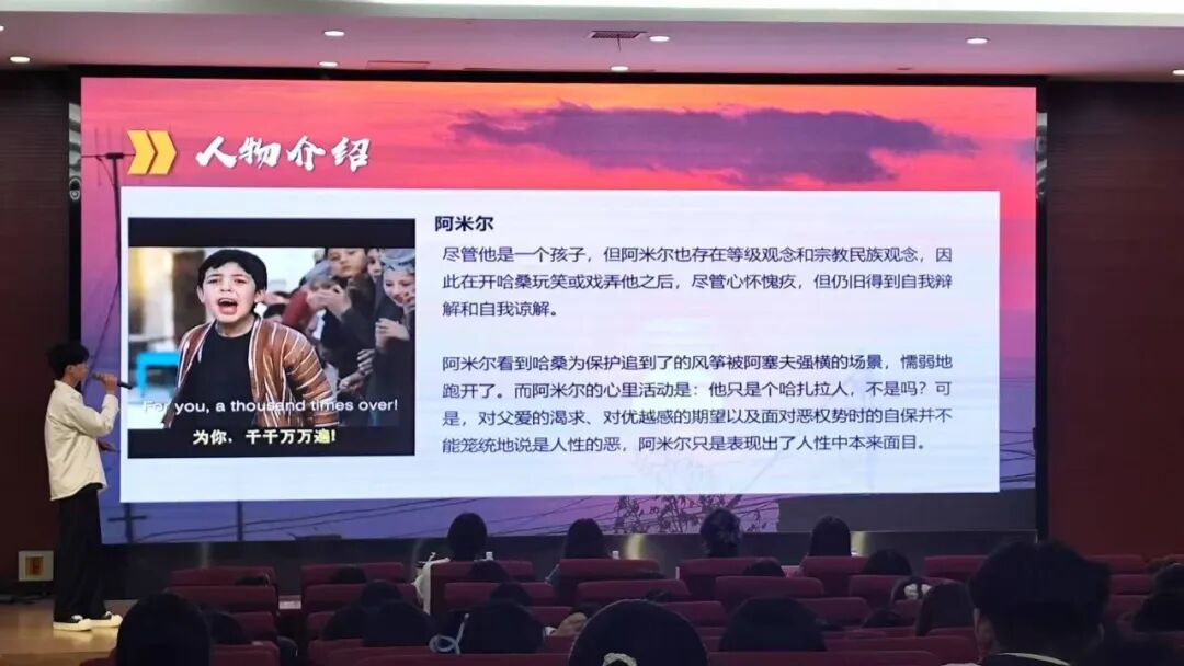 活动在主持人精彩致辞中拉开帷幕。任奥开通过解读《追风筝的人》,深入剖析人性的复杂与真诚;魏骊颖分享《活着》,展现生命在苦难中的坚韧力量;吴雯垚解析《悲惨世界》,引领观众感受人性光辉。随后孙艺敏表演古典舞蹈《簪花赋》,以优雅舞姿展现传统艺术魅力,将现场气氛推向高潮。李佳玥带领观众走进《哈姆雷特》的戏剧世界,探讨生存与良知的主题;秦畅结合《平凡的世界》中人物的奋斗历程,启发同学们珍惜当下;郭一慧通过《山腰上的中国红旗渠》讲述艰苦奋斗精神;宁子涵借《你当像鸟飞往你的山》传递教育改变命运的力量;王淋解读《瓦尔登湖》,引导大家在沉思中寻找生活本真。最后,齐骥演唱《爱笑的眼睛》,以温暖旋律为活动画上圆满句号。