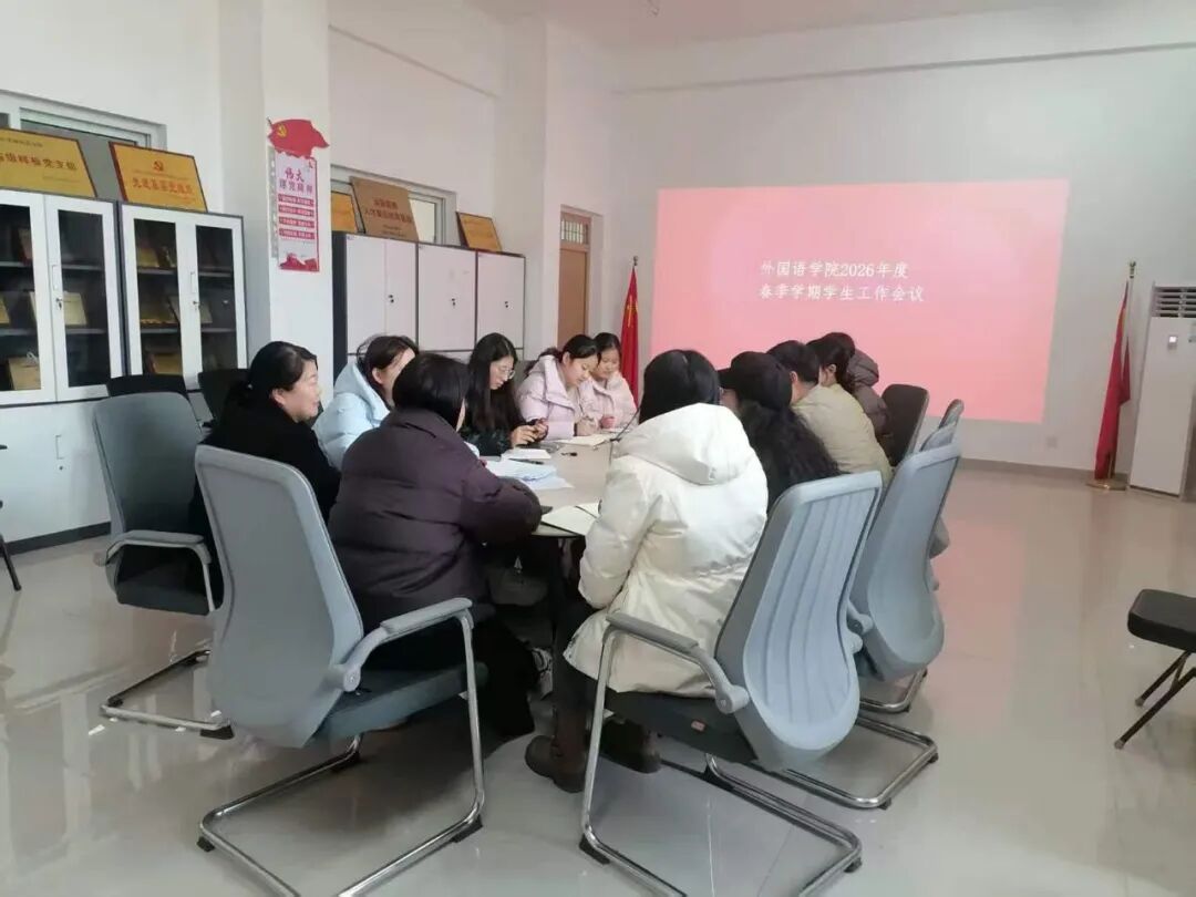 2026年3月2日,外国语学院在第二教学楼402会议室召开2026年度春季学期学生工作会议。会议由学院党委副书记王伟主持,全体辅导员参加。