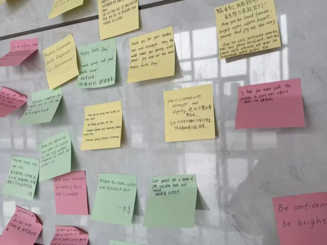 活动期间,南北两校区分别设置了多语种祝福展板,集中展示英语、法语、日语等多种语言书写的积极寄语。祝福内容围绕自我激励、情感支持、人际关怀与未来展望展开,既有对友人的暖心鼓励,也有对生活的热爱表达和对自我的温柔期许。同学们通过书写便签的方式,用所学语言抒发内心情感,在文字中传递温暖,在交流中靠近彼此。参与学生表示,此次活动形式新颖温馨,既提供了一个安全包容的表达空间,也增强了语言学习的现实意义和心理共鸣。