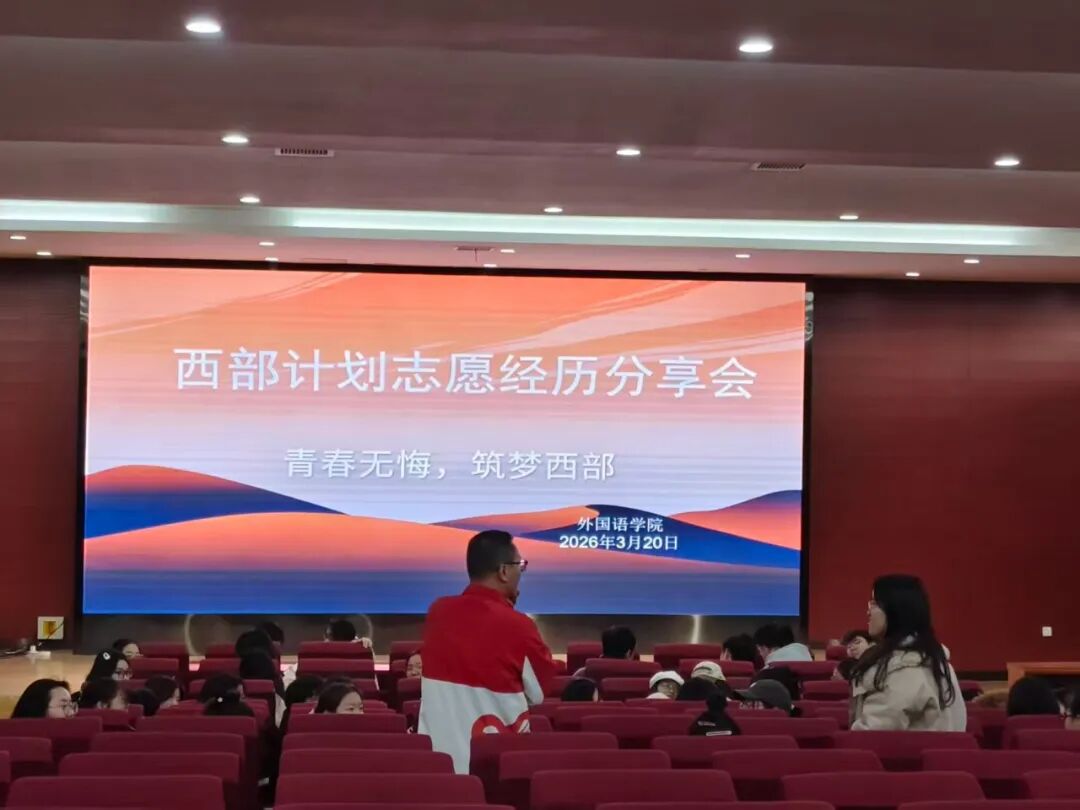 为深入贯彻习近平新时代中国特色社会主义思想,扎实推进大学生志愿服务西部计划实施,引导青年学子以青春之力服务基层、筑梦西部,3月20日下午,外国语学院在学院楼报告厅成功举办西部计划志愿经历分享会。