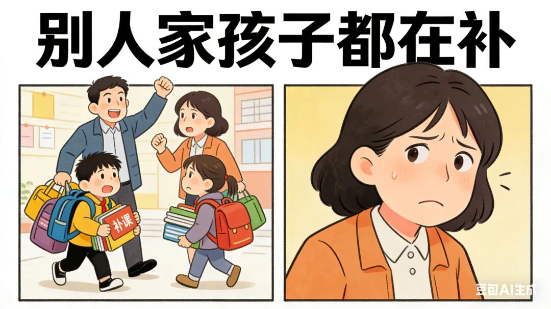 补课焦虑的真正来源,并不在孩子,而在成人世界的攀比结构。看到邻居、同学都在补课,便推断“不补就会落后”;成绩被误认为是单一排名,学习被简化为一场“多花钱、多挤时间”的投入竞赛。于是,补课从“阶段性支持”,异化为“身份与安全感的象征”,并把经济与情感压力层层转嫁到家庭的三代人身上。