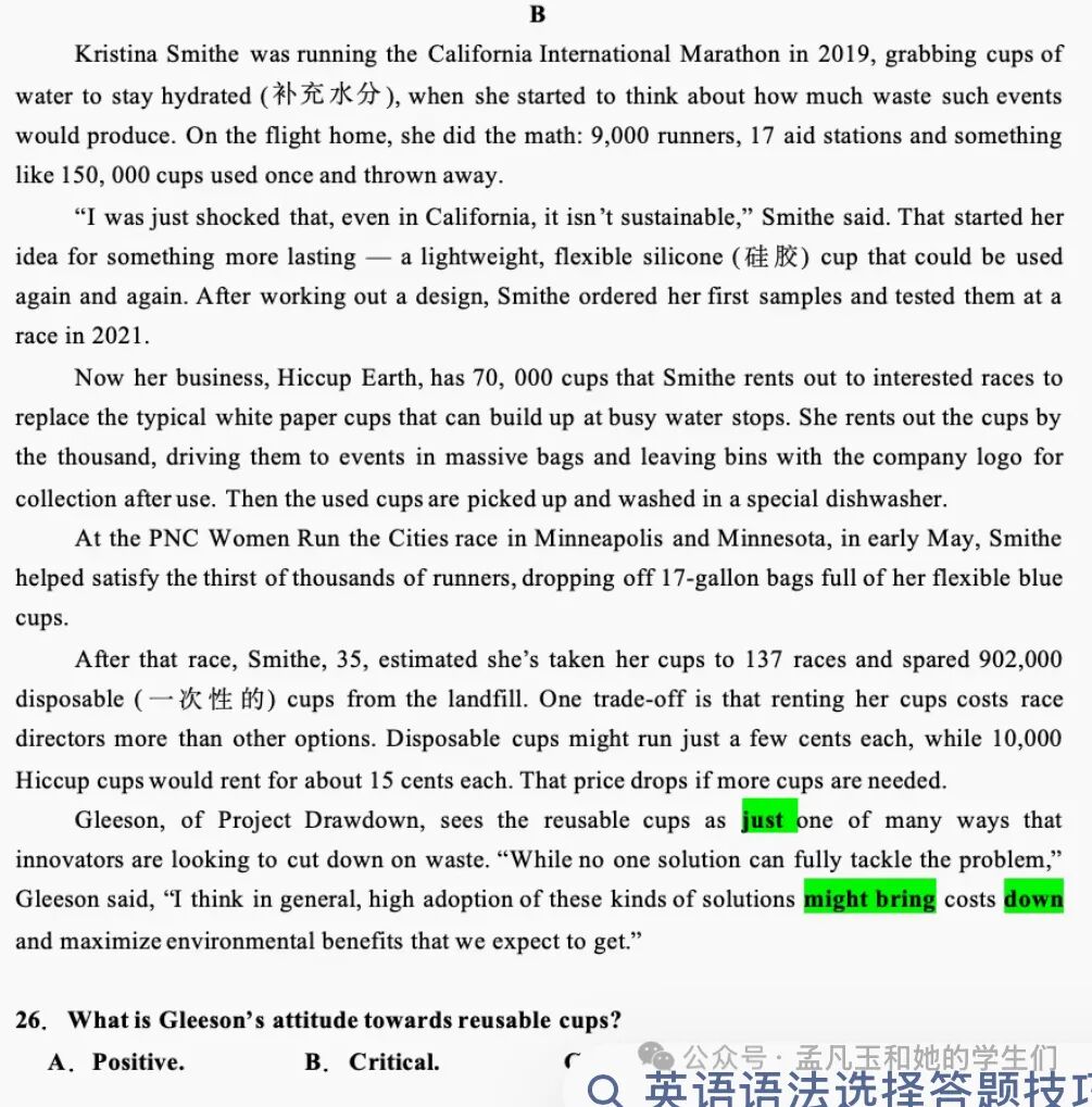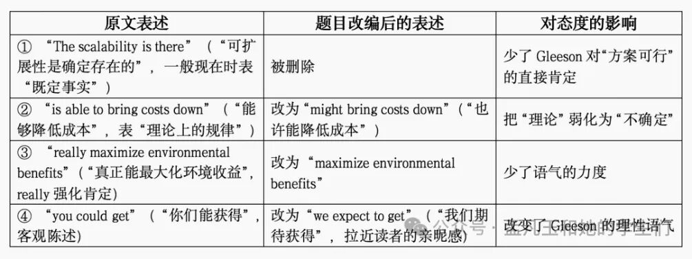 她讲的是 Q26:作者对 Gleeson 方案的态度。很多学生选对了 positive(积极),却觉得文中的 might bring 和 just 读起来不够“笃定”。她没有用“考试就这样,别钻牛角尖”来敷衍,而是把学生的纠结当成一个真实的语言问题: 为什么语感会产生这种“不对劲”?文本里有没有更硬的证据能把态度钉住?
