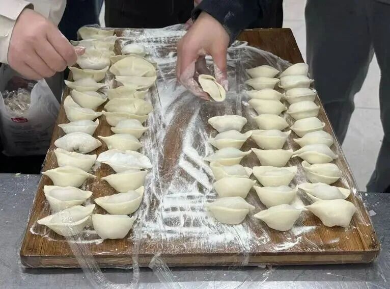 上午九点,活动现场早已布置妥当。师生们纷纷挽起袖子,分工协作,大家手法各异,创意纷呈:有的饺子形如月牙,有的状似元宝,还有同学别出心裁地包入“惊喜馅料”,为活动增添了阵阵欢笑。现场气氛轻松热烈,师生一边忙碌,一边交谈,其乐融融。
